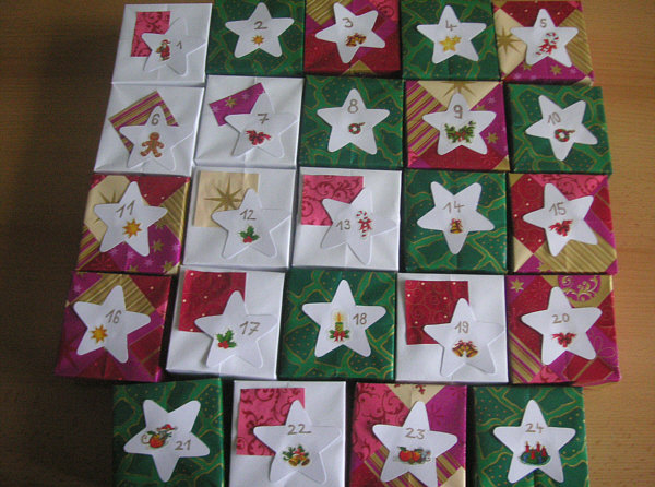 In 24 kleinen Schachteln sind Strohsterne, Pfefferkuchen,