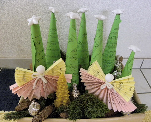 dem Herrn Pfarrer ein Arrangement mit den Notenblättern der Lieder gebastelt.