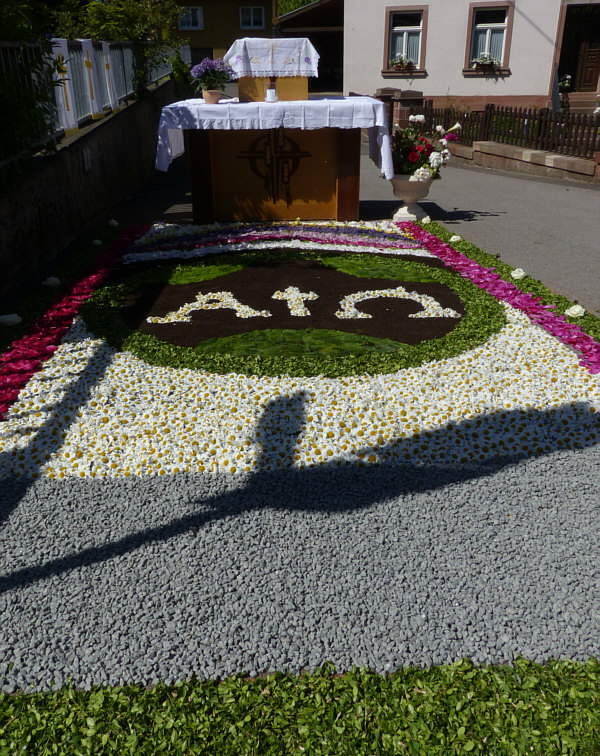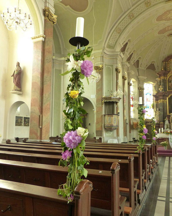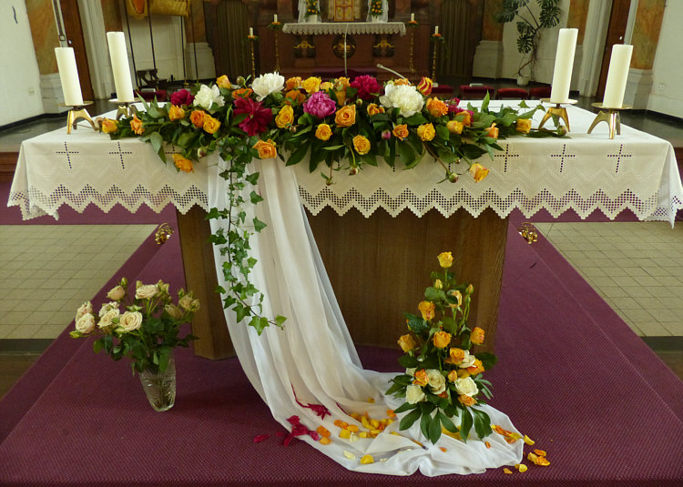 Aber gehen wir doch mal in eine Kirche ... der Blumenschmuck auf dem Altar ...