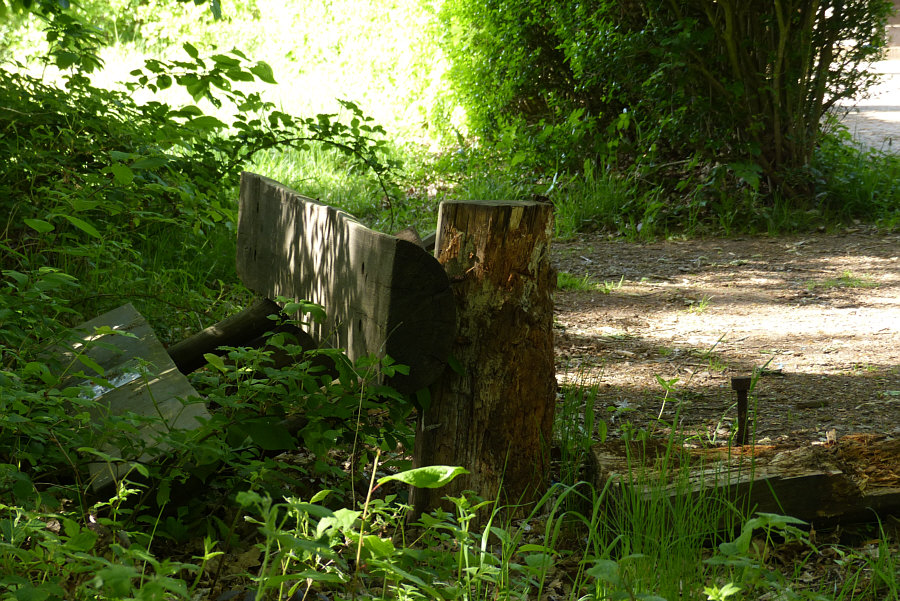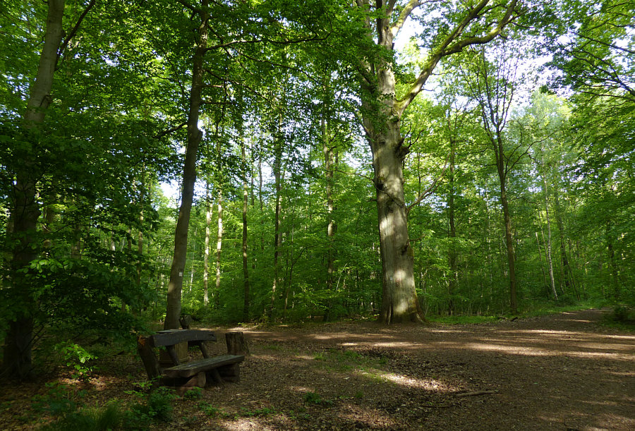 Wir kommen an einer Bank und einem großen Baum vorbei ...