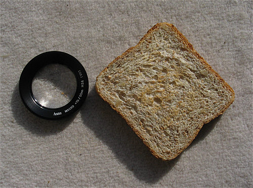 die bekannte Welt: ![]() ein Toastbrot und eine Tür. Die Tür wird auch als Makrolinse bezeichnet ;). Es ist eine +10-Dioptrien-Linse. Jemand Jüngeres würde "saugeiles Teil" dazu sagen *g*. Ich sage "Tür" dazu, denn diese Makrolinse öffnet uns eine Tür in eine bekannte, aber so noch nie gesehene Welt. Machen wir einen Sprung mitten ins .. Toastbrot |
