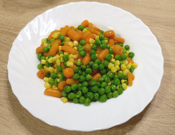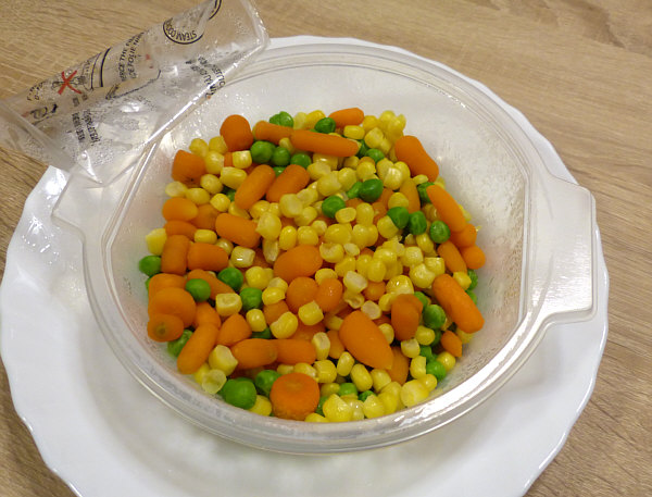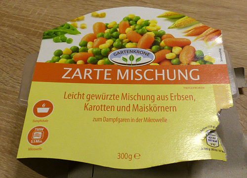 das hier ist die "zarte Mischung" mit Erbsen, Karotten und Maiskörnern.