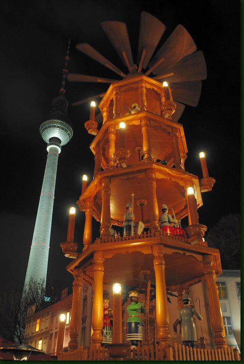 Auf dem Markt steht eine solche Pyramide und im Hintergrund ist der Berliner