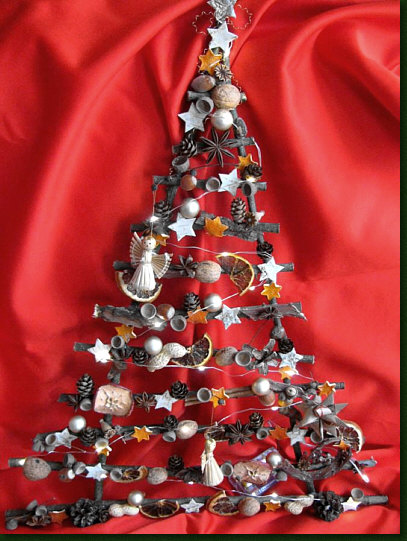 aus Stöckchen mit Naturdeko und einer Lichterkette.