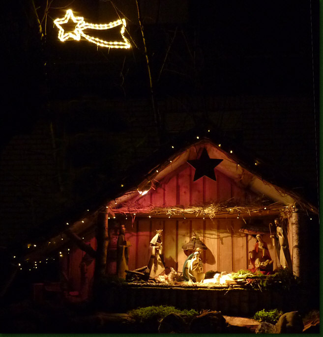 in einer Straße in mehreren Vorgärten Krippen oder Krippenfiguren gesehen habe.