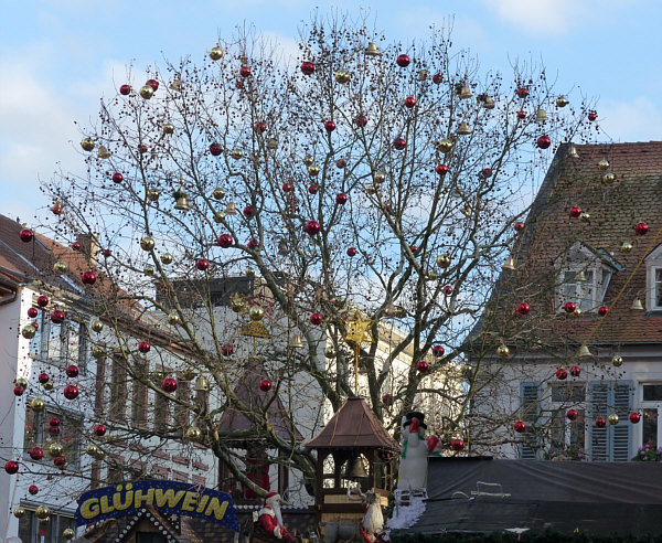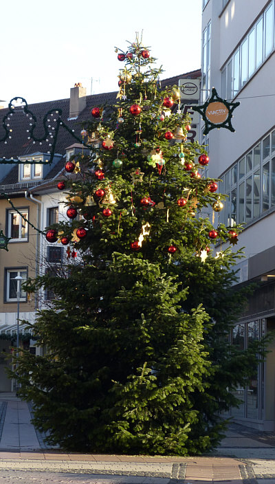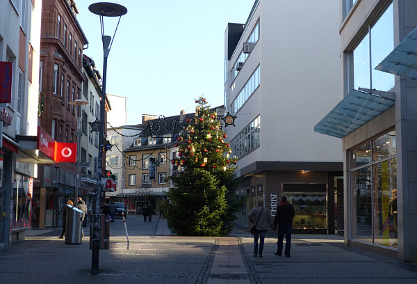 Da vorne das ist der eine große Weihnachtsbaum in der Fußgängerzone