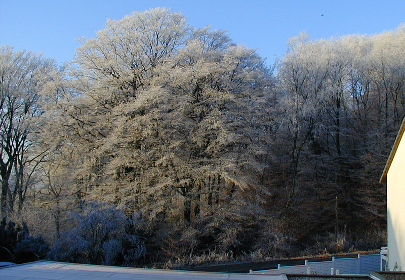 Auch die großen Bäume hinterm Haus tragen Raureifschmuck: