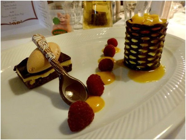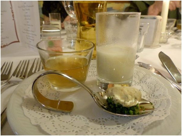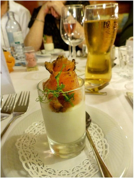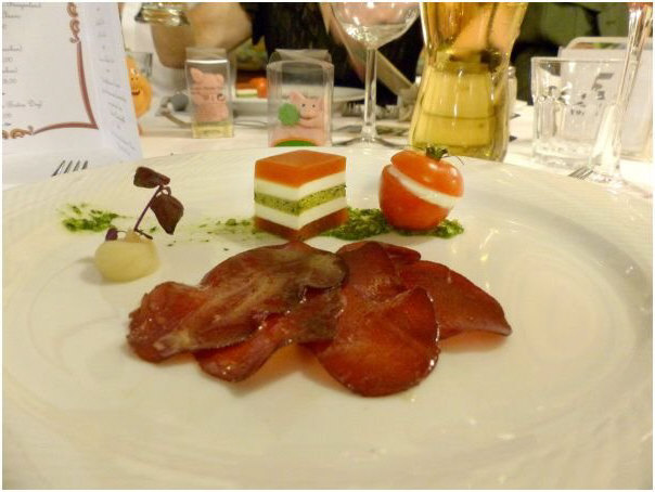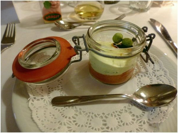 Gestern Worte und Fragen, heute gibts nun wirklich was zu Essen. Ja, nicht wirklich für die Geschmackssinne, sondern es wird ein Fest für die Augen. So können wir ganz entspannt genießen :)). Heidi P. hat im Rahmen einer Reise dieses 7-Gänge-Menü serviert bekommen und wir dürfen nun mal schauen :)). ![]() 1. Panna Cotta vom Blumenkohl mit Graved-Lachs-Rose ![]() 2. Kochschinken-Carpaccio mit Ahornessig und Macadamianussöl Ziegenfrischkäse-Würfel ![]() 3. Essenz vom Bio-Huhn mit Kräuterfarcenockerl Ingwer-Mandelshatt ![]() 4. Lachs trifft Hecht auf Broccoli-Insel ![]() 5. Tomaten-Basilikum-Sorbet ![]() 6. Schweinefilet-Türmchen im Tramazini Spiegel von Rotwein aus dem Barrique-Eichenfass Junges mediterranes Gemüse Kürbis-Maisgrießsoufflé ![]() 7. Creme Katalan mit Tonkabohnen-Mousse Mango hinter Gitter Ein Festmenü für die Augen. Na ... wäre das auch etwas für Dich gewesen ? Nicht nur als Bild, sondern als Teller vor Dir ? Du hättest vier Stunden Zeit für alle Gänge. Hättest Du alles gegessen bzw. von allem probiert ? |