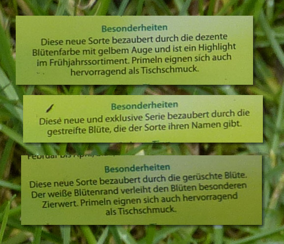 Die Leser meines Tagebuchs hatten schon das Vergnügen, diese Bilder zu sehen: ![]() ![]() Gefüllte Primeln und meine Leser waren so begeistert wie ich auch. "Sehen aus wie Rosen" hat mancher gesagt und das sind auch "Rosenprimeln". Ich wollte mehr davon sehen und bin mit Beate dorthin, wo sie tags zuvor schon war ... ins Dehner Gartencenter. Dort gab es sie auch in gelb ... ![]() ... und vielleicht noch in anderen Farben, aber es war kaum noch was da. Dafür waren andere Varianten da ... ich zeige mal Ausschnitte aus den Infosteckern der Pflanzen: ![]() Leute ... ich konnte nicht mehr an mich halten ... ein Traum, was ich da gesehen habe. Da musste ich doch einige kaufen ... und jetzt erhöhe die Spannung, denn die Bilder folgen noch. Führe mich nicht in Versuchung ;)) ... kann man Dich auch in Versuchung führen, wenn man Dich in ein Gartencenter vor wunderschöne Primelchen stellt ?? |