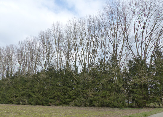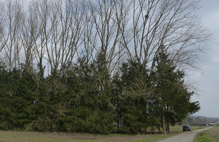Der Tag der 5-7 Kalenderblätter ... ... der war völlig überraschend am vergangenen Samstag. Eigentlich waren wir nur, wie wir das alle 3-4 Wochen machen (es zumindest vorhaben), bei diesem tollen Obst- und Gemüsegeschäft in Frankreich, fuhren dann nach Hause ... und ja, "eigentlich" wollten wir noch spazieren gehen. Uneigentlich waren wir beide müde ... wir hatten dort zum Mittag gegessen und das hatte uns irgendwie umgehauen ... nach dem Essen sollst du ruhen oder so ... ... der Verstand sagte "laufen, wenigstens ein wenig", das Gefühl sagte "will nach Hause, müde". Okay ... der Verstand hatte fast gesiegt ... ich hatte mir einen kleinen Ort in Frankreich ausgesucht, wo wir spazieren werden ... dort angekommen ... steile Straßen ... nöö ... mag ich nicht. Sieht man halt auf dem Navi nicht, wie steil das ist und bergauf gehen wollte ich nicht. Also einfach über die Dörfer nach Hause fahren ... ... mit einer kleinen Bereitschaft, vielleicht doch noch zu laufen und wenn nicht, dann eben nicht ... und so kams, dass wir ein paar Mal anhielten, weil ... uns dieses und jenes begegnete, das interessant genug für einen Halt war. Beim ersten Mal war es eine Kirche ... die leider geschlossen war. Dann ein paar Krokusse im Vorgarten. Dann dieses Stück Wald ... ![]() ... das sah von weitem so aus, als würden da Laubbäume aus Tannen wachsen. Als wären das unten Nadelbäume und oben was anderes. Sah komisch aus ... aber auch interessant. Muss ich hin, will ich sehen. Irgendwie stehen die Bäume, und es sind keine jungen, alle auf einem Platz ... ... wie mag das von Nahem aussehen ... das sind so Sachen, die vielleicht anders aussehen als sonst und sowas zieht mich magisch an ;)). Ich hatte recht ... ... welche Bäume das sind, weiß ich aber immer noch nicht mit Sicherheit. Ich gehe mal von Tannen und Pappeln aus. Ich vermute, dieser schmale, langgestreckte Wald wurde als Erosions- und/oder Windschutz-Gründen angelegt. Damit der Wind nicht die Erde von den Feldern weht. Zitat "Es hat sich gezeigt, dass halbdurchlässige, schmale Waldstreifen mit einem Unterstand niedriger Bäume und Sträucher als Windbremse wirksamer sind als ein geschlossener, großer Waldkomplex" ... und so ein schmaler Waldstreifen dürfte das sein. Das alles weiß ich im Nachhinein ... als ich dort war, habe ich mir das einfach nur angeschaut ... ![]() Hier steht schon mein Auto ... und Beate sucht derweil irgendwo im Wald nach Deko-Ästen für daheim. Vom Auto aus gesehen ... also vom Weg aus auf den Wald schauend ... ![]() ![]() ... zeigt das linke Bild den Blick in den linken Teil des Waldes und das rechte Bild den rechten ... im rechten Bild links ist der efeubewachsene Baum von links auch zu sehen. Und wir dürfen die Rinde der alten Bäume bewundern ... während junge Pappeln eine glatte Rinde haben, haben solch alte Exemplare eine raue und gefurchte Borke. Gehen wir mal im rechten Bild weiter ... und stellen uns neben diesen großen Baum ... ![]() ... da sehen wir eine fast mystische Allee. Ein paar Schritte weiter gehen ... und dann ... inne halten. ![]() Die Sonne kam ... ganz kurz ... und gestattete mir nur ein einziges Bild: ![]() Später, beim Weiterfahren, habe ich nochmal angehalten für den "Blick zurück": ![]() Das war Kalenderblatt 1 vom Tag der vielen Kalenderblätter ... morgen fahren wir weiter. |