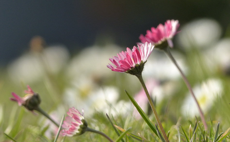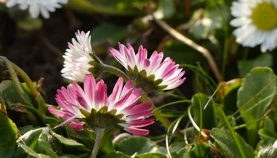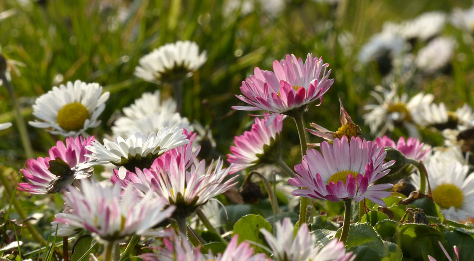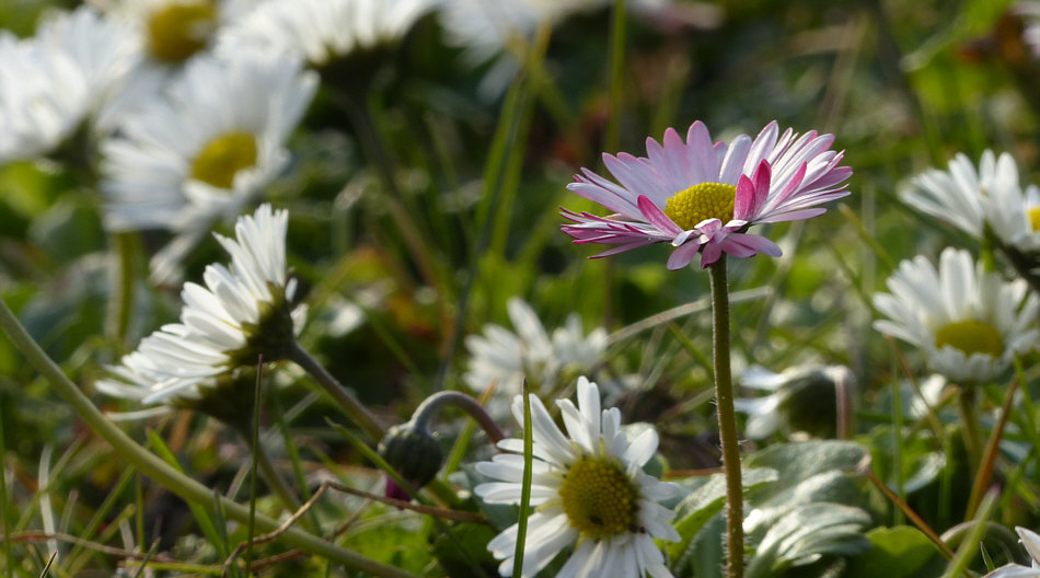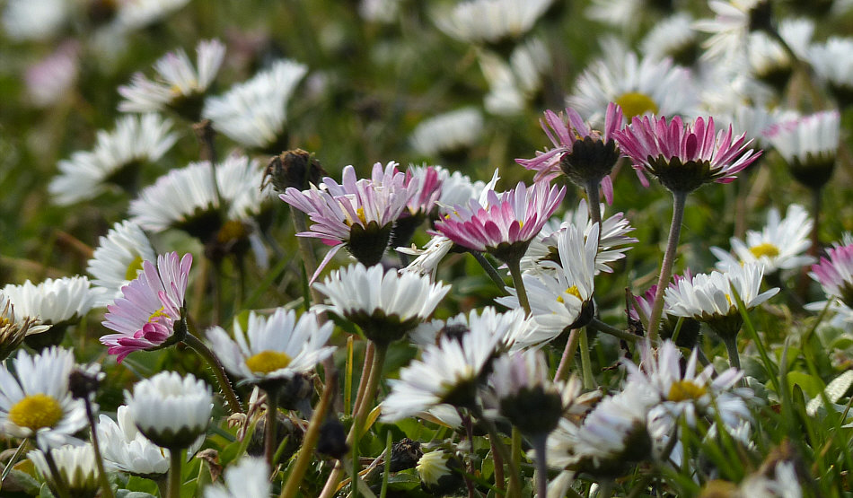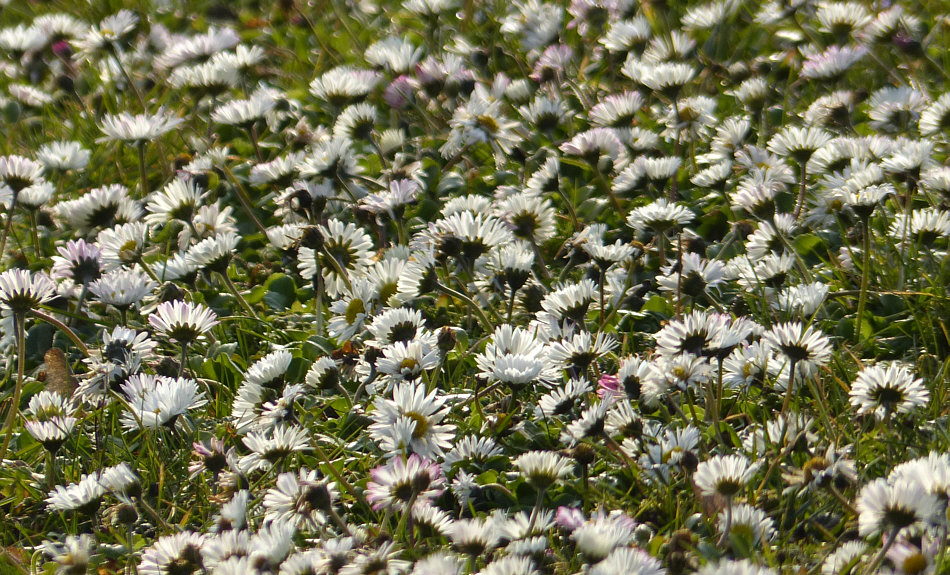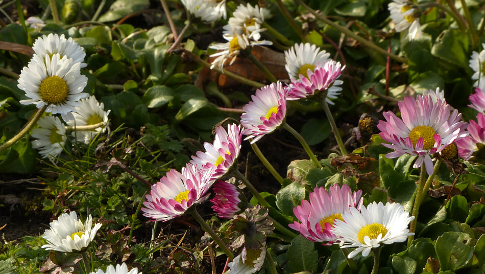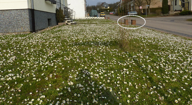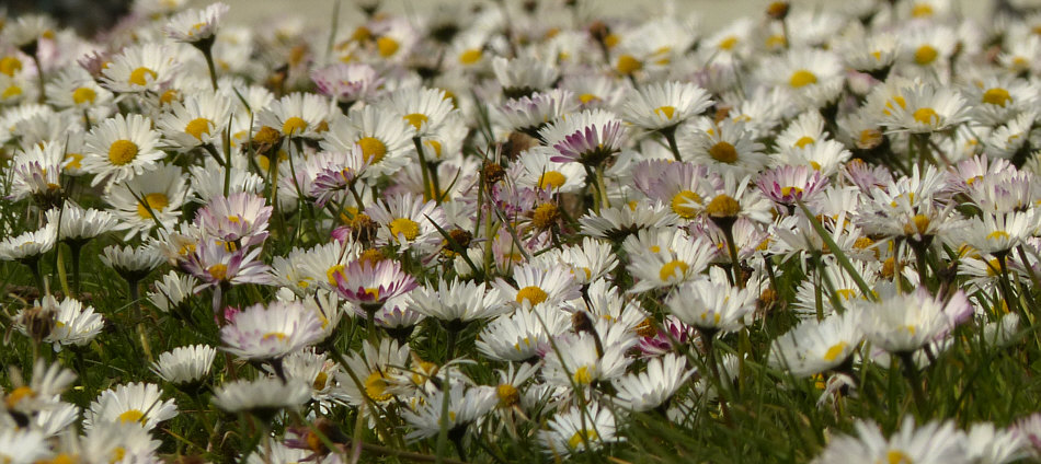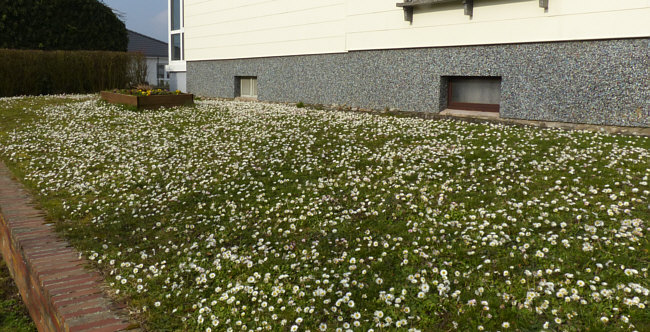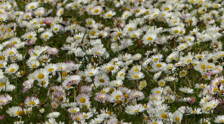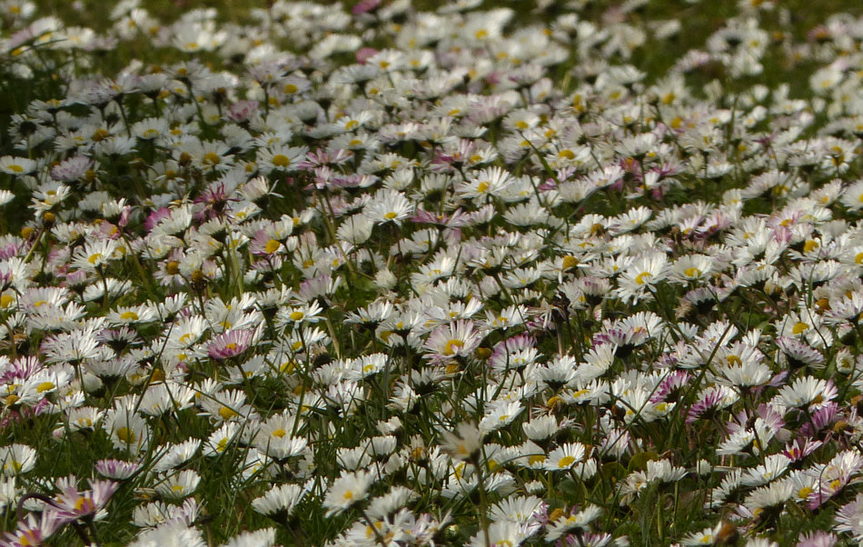 Der Tag der Kalenderblätter - Blatt 7 Zum Schluß dieser Serie ... 7 Kalenderblätter von einem Tag ... ... kommt natürlich der Höhepunkt dran :)). Direkt bei den Waschbeton-Platten. ![]() Ein Meer aus kleinen weißen Punkten ... ![]() ... die alle Gänseblümchen sind: ![]() Dort hinten (Kreis) sind die beiden Waschbetonplatten, von denen ich Nahaufnahmen gezeigt hatte. Nun lasst uns ins weiße Meer tauchen: ![]() Also mehr geht ja nun wirklich nicht ... es ist der Waaahnsinn. ![]() Ist es das weiße Meer ... oder sind es weiße Boote im grünen Meer ? ![]() Es ist ein Traum ... besonders dekorativ sind die manchmal rötlichen Unterseiten der Blümchen. Es gibt unendlich viele Namen für diese Blume ... die jungen Blätter am Inneren der Rosette sollen besonders gut schmecken. Und die Knospen und halb geöffneten Blüten sollen nußartig schmecken. Aber wir essen heute nicht ... wir schauen und schauen und schauen. ![]() Mehr als hundert Blütenblätter hat eine Blume und diese weiße Pracht mit ein bißchen Rot genießen wir nun mit unseren Augen: ![]() ![]() ![]() ![]() ![]() ![]() |