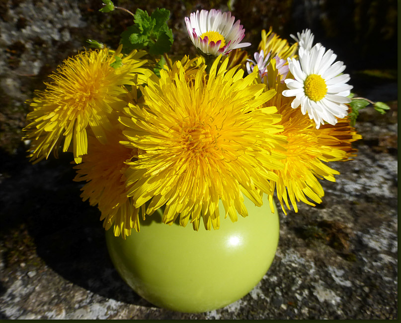 Man nehme eine kleine Vase, mache einen Streifzug durch Garten und den nahen Wegesrand ... ![]() ... und schon hat man den ersten Wildblumenstrauß des Jahres. Bei Lamarmotte (im Süden Frankreichs, Nähe Pyrenäen) blüht der Löwenzahn schon und leuchtet mit den Gänseblümchen und der Frühlingssonne um die Wette :)). |