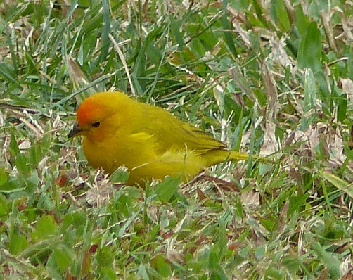 Sie singt melodisch und sucht auf dem Boden nach Samen.