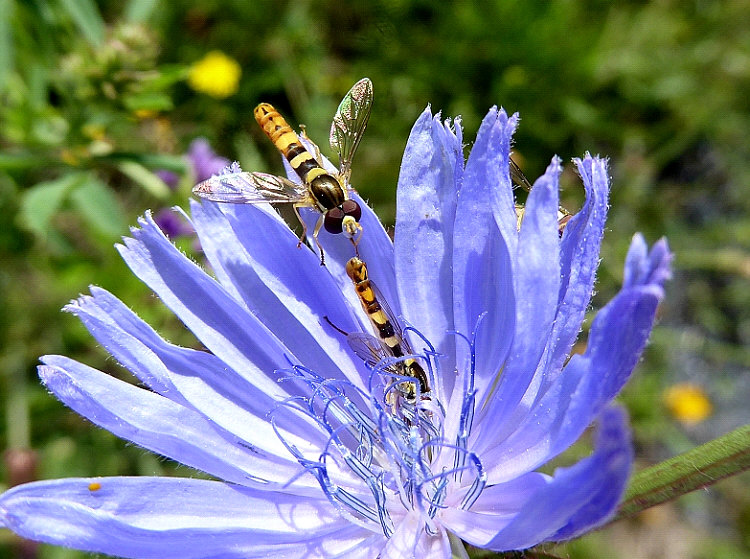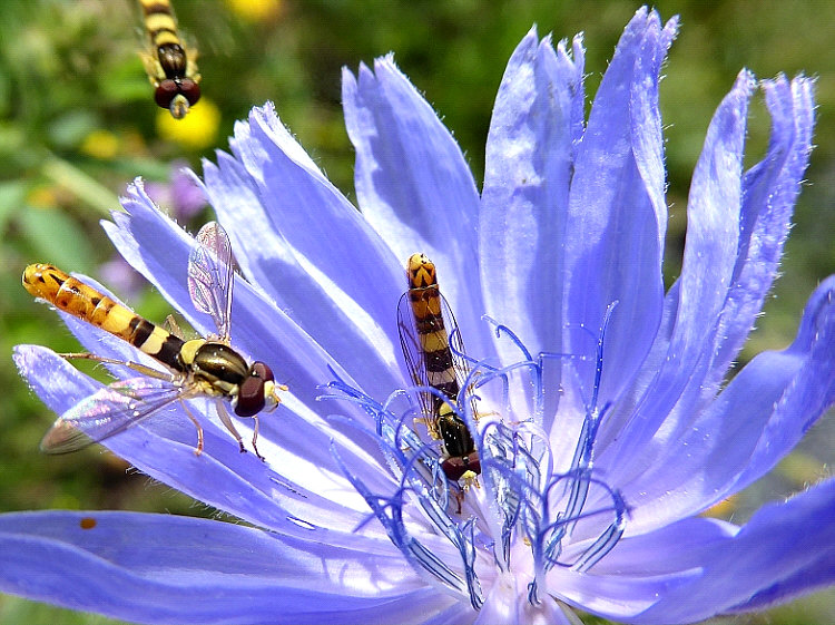 aber ganz harmlose Schwebfliegen sind, die gar nicht stechen können.