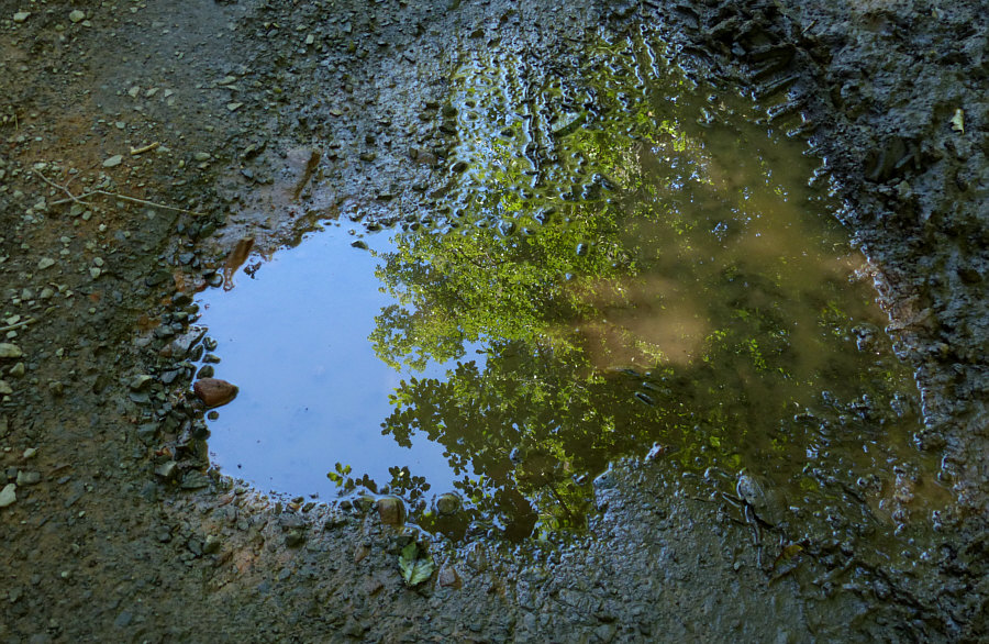 Sogar in den Pfützen spiegelt sich der sonnige Wald ...
