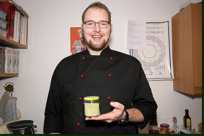 ... er hat Blättchen zusammen mit dem Salz in das Gerät getan und dann