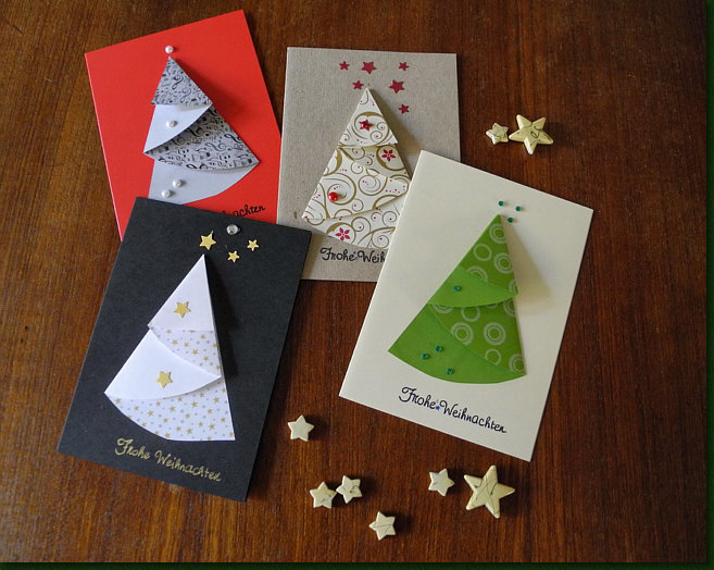 Heute sind es Halbkreise, die gefaltet und dann auf neutrale Klappkarten geklebt werden. Einen oder mehrere Sterne dazu ... fertig. weiter
