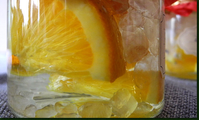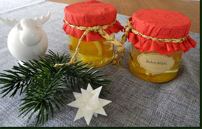 In kleine Schraubgläser jeweils eine Scheibe (geviertelt) der Bio-Orange und 2