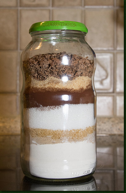 und mit einem Aufkleber "Brownie-Backmischung" verschenkt werden.
