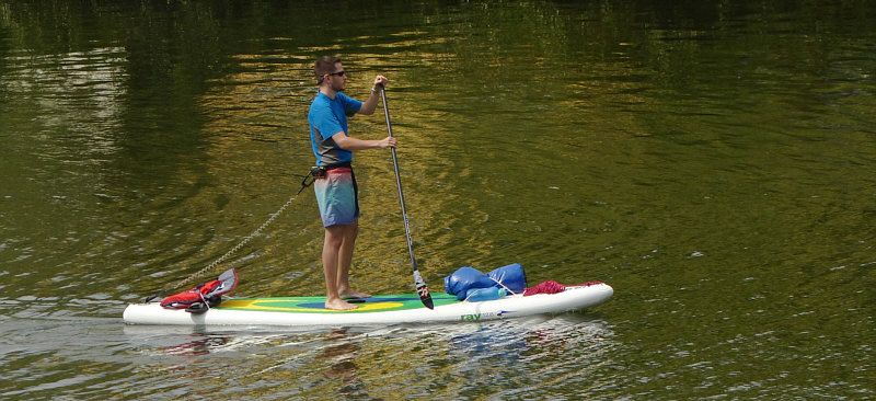 ... dabei steht man auf einem (aufblasbaren) Surfbrett und paddelt zum