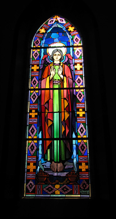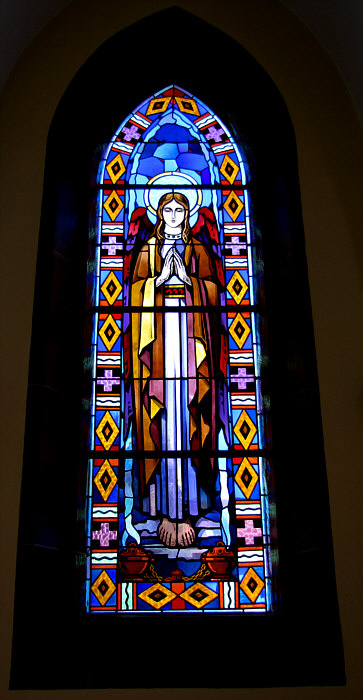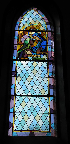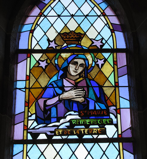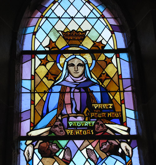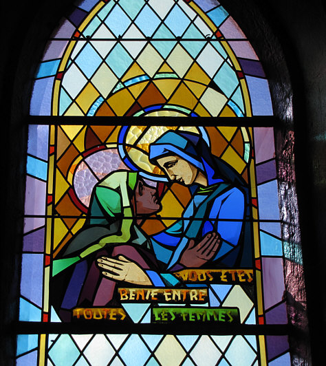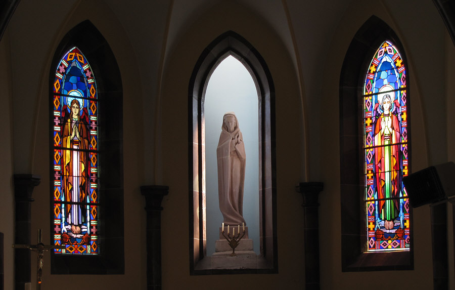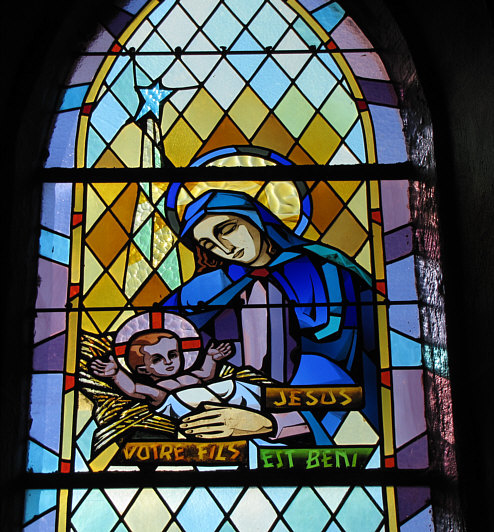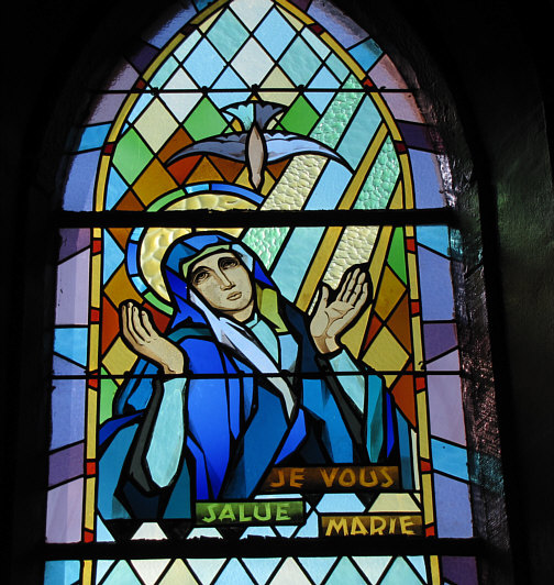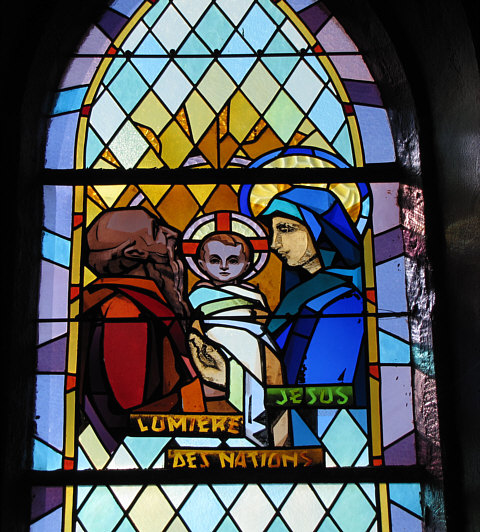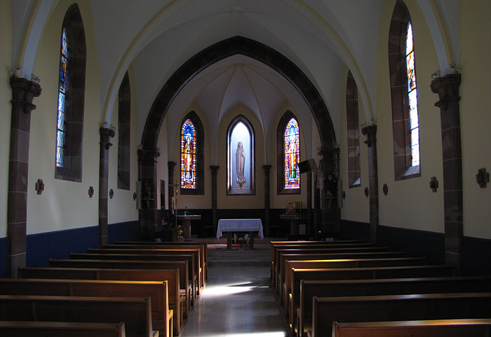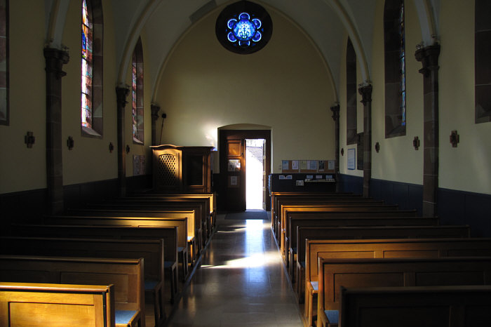Das ist die Sonntagskirche vom letzten Sonntag ... ![]() ... vom Altar aus gesehen sieht die Kapelle so aus: ![]() ... und so sieht sie von außen aus: ![]() Das ist die "chapelle Notre-Dame" in Bärenthal, einer winzig kleinen Gemeinde in Frankreich, nicht weit von der pfälzischen Grenze entfernt. Ich gehe mal näher die Skulptur ran: ![]() ![]() Die beiden Fenster kann ich auch in größer zeigen: ![]() ![]() Auch die anderen Fenster sind wunderschön: ![]() Es sind sehr lange Fenster ... ich zeige Euch mal jeweils die Motive der Glasmalerei: ![]() ![]() ![]() ![]() ![]() ![]() Wenn es so viele bunte Fenster gibt und dazu die Sonne scheint, dann werfen diese Fenster Farbspiele in den Raum: ![]() ![]() Der liebe Gott hat ein Bild gemalt. |