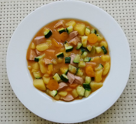 Kartoffel-Gemüse-Gulasch mit Fleischwurst (wahrscheinlich Frauen- und