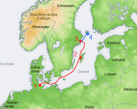 ![]() Tag 5 Wir sitzen beim Frühstück und blicken mal kurz zurück ... ![]() ... bei 1 sind wir in Kiel gestartet. Es folgt ein Tag auf See, weil das bis 2 (Visby) doch immerhin 707 Kilometer sind. Nach 3 (Stockholm) sind wir über 283 km über Nacht gefahren. Der Weg in der letzten Nacht war noch kürzer, nur 150 Kilometer. Wir sind wieder auf einer Insel (besser Inselgruppe) ... sie liegt zwischen Schweden und Finnland. ![]() Sie gehört zu Finnland, die Inselsprache ist aber schwedisch. Sehr beliebt bei Tagesausflüglern, denn hier kann man steuerfrei einkaufen. Wir sind in Åland, nur korrekt mit dem Kringel auf dem a. Aber ausgesprochen wird der Name Oland. Insgesamt sind das 6700 Inseln und Schären ... wir sind auf der Hauptinsel, die ca. 50 Kilometer breit und ebenso hoch ist, Fasta Åland heißt und ca. 70 Prozent von der Inselgruppe einnimmt. Wir sind nicht nur auf der Hauptinsel, sondern auch in der Provinzhauptstadt, in Mariehamn. 11500 Menschen leben hier und heute sind es ein paar mehr auf den Straßen, denn wir und die Aida sind hier :)). Aber erstmal schauen, wie das Wetter wird: ![]() Ja wie wunderbar ... super, top, Supercalifragilisticexpialigetisch. Oder auch superkalifragilistisch expiallegorisch ... oder so. Was das für komische Worte sind ? Nein, nicht finnisch oder schwedisch ... das Original ist englisch und im Musical Mary Poppins zu finden. Zurück nun aber zur Insel ... Oland. Ooooh Land ... guck mal ... da gehn wir hin. Das erste, was wir sehen, ist ein altes Schiff ... ![]() Das ist die "Pommern", ein 1903 gebautes Schiff. Eine stählerne Viermastbark (Windjammer) ... hier ihre wechselvolle Geschichte: - die ersten vier Reisen führten zur Salpeterküste von Chile (Kohli hin, Salpeter zurück) - danach wechselnde deutsche Besitzer und Kapitäne - 1921 kam sie als Kriegsreparation nach Griechenland - 1923 kaufte ein finnischer Großreader die Pommern und seitdem ist Mariehamn der Heimathafen - sie transportierte nun 15 Jahre lang Weizen zwischen Australien und Europa - während des 2. Weltkrieges lag sie im Hafen und ab 1944 sicherheitshalber in Stockholm - dort wurde sie als Getreidespeicher eingesetzt - 1947 der Reeder starb, sein Sohn erbte das Schiff und schenkt es der Stadt Mariehamn unter der Bedingung, das Schiff unverändert zu erhalten. Sie gilt heute als einzig erhaltene Viermastbark im Originalzustand, auch unter Deck. ![]() Wir hätten ja gerne das Schiff besichtigt, aber es wird gerade restauriert. Also gehen wir weiter ... durch ein hügeliges Waldgebiet ... ![]() ... mit toller Aussicht: ![]() Wir rufen in Richtung Schiff ... "hey, heute scheint der Wetterbericht ja mal zu stimmen". Wir kommen nun ins Stadtgebiet und laufen ein wenig so wunderbar besonnt an den Häusern vorbei ... und kommen zu einer Kirche: ![]() Das ist die St.-Georgs-Kirche ... und erfreut stellen wir fest, das sie offen ist und gehen hinein: ![]() Willkommen in der Sonntagskirche von Seelenfarben :)). Deine Gedanken zur heutigen Folge der Sommerreise ? Deine Gedanken zu diesem Kircheninnenraum ? |