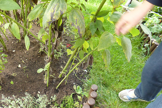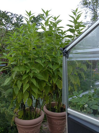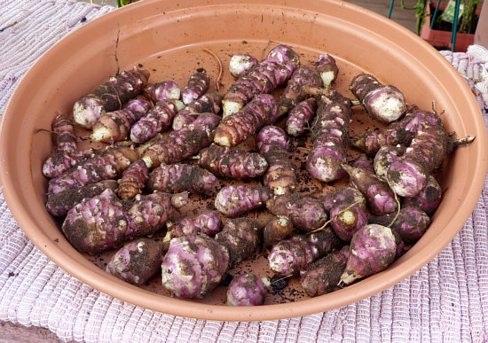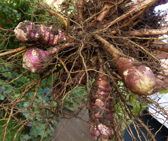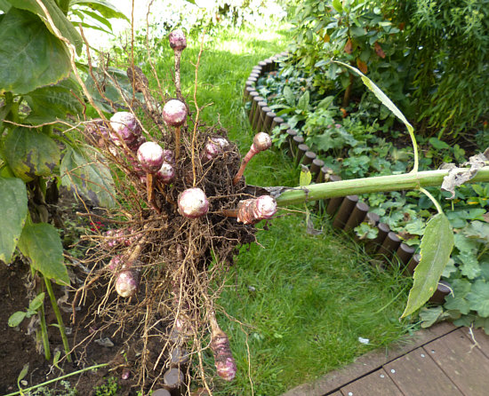 Es war einmal im letzten Jahr ... da hatten wir in Frankreich Topinambur gekauft ... sooo toll hat er und nicht geschmeckt, obwohl er ja super gesund ist, und so passierte es eben, dass noch welcher übrig blieb. Da ich ja wusste, dass Topinambur schön blüht (wie kleine Sonnenblumen), zu Mamas Zeiten hatten wir die Blumen immer im Garten, entstand die "ach, die setz ich in Töpfe"-Idee. Gesagt getan ... so sah das dann aus: ![]() Vor dem ersten Frost wollte Beate die Pflanzen aus dem Topf rausmachen ... ging nicht. Der Topinambur war dermaßen verwurzelt, dass er nicht mehr aus dem Topf rausging. Also hat Beate einfach die Pflanzen abgeschnitten und den Topf mit dem Boden nach oben in den Garten gestellt. Nach dem Motto "ich lasse das mal eine Zeitlang so, bis die Erde gut abgetrocknet ist, vielleicht gehen die Wurzelstöcke dann ja leichter raus ... und Monate später war das tatsächlich so. Jetzt hatte Beate aber einige Topinambur-Stücke da rum liegen, die sie dann einfach beim Umgraben mit untergegraben hat. Monate später ist ein Urwald entstanden ... während die Pflanzen da oben so hoch wie das Frühbeet waren ... sind sie nun (Bild von gestern) ... ![]() in etwa doppelt so hoch gewachsen. Nur blühen sie immer noch nicht, dabei ist jetzt die Blütezeit dieser Pflanze. Da hab ich gesagt ... mach doch mal eine raus ... vielleicht ist die Kraft in die Wurzel gegangen. Also hat Beate mal kräftig oben gezogen ... ![]() ... diese Pflanzen gehen ja ziemlich einfach raus. Und tatsächlich ... ![]() ... es hingen viele kleine Topinambubchen dran ... ![]() ... da hat sich das Einpflanzen richtig gelohnt, so man das getan hätte, um sie essen zu wollen. Die hatten uns damals ja nicht so toll geschmeckt ... aber vielleicht hatten wir sie nicht optimal zubereitet oder die Zeit war noch nicht reif dafür ;)). Nach dem Ernten eines kleinen Teils des Urwalds haben wir nun schon ... ![]() ... eine ganze Mahlzeit zusammen und ich darf mir nun überlegen, wie sie zubereitet werden sollen. Vielleicht lese ich auch einfach die Kommentare ... vielleicht stehen da ja Erfahrungen der Seelenfärbler mit diesem Wurzelgemüse ... vielleicht sogar Rezept-Tipps. |