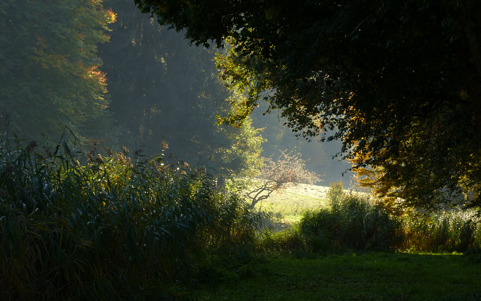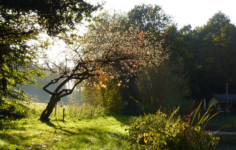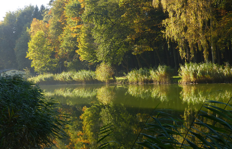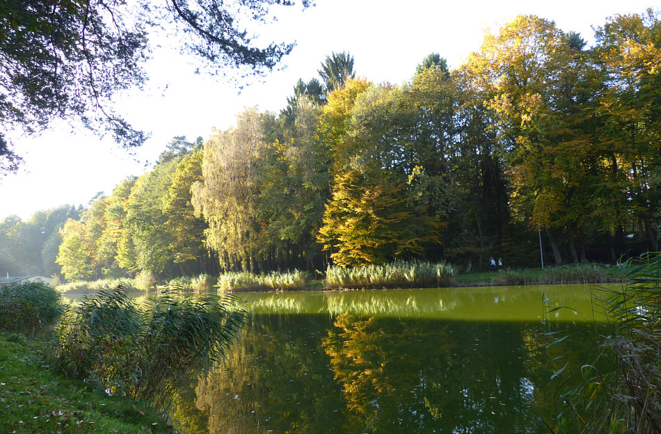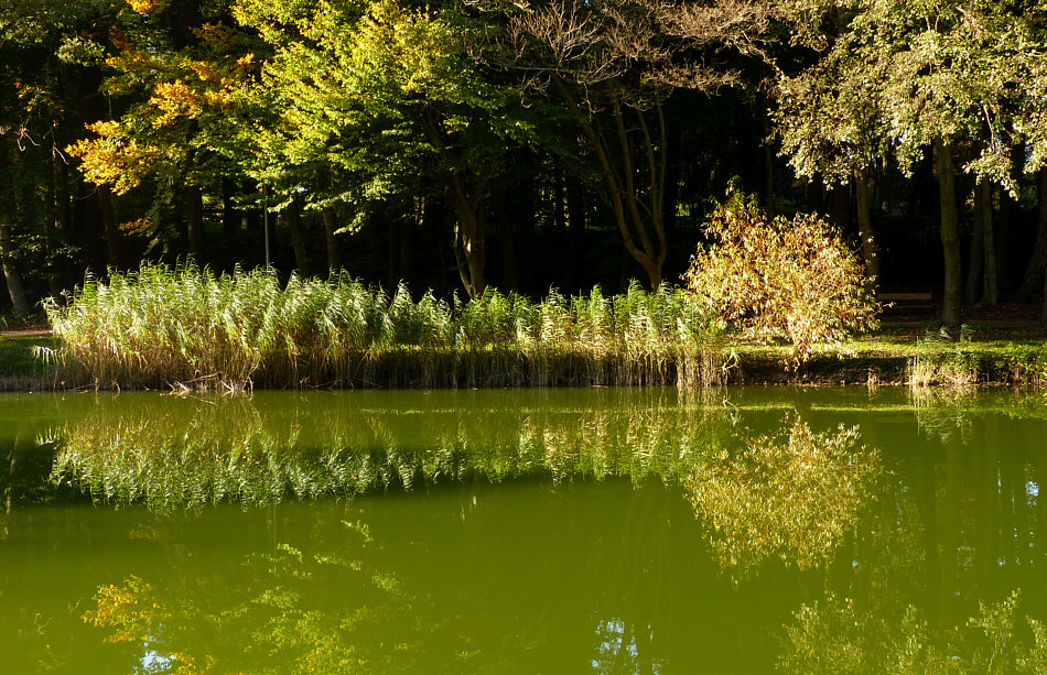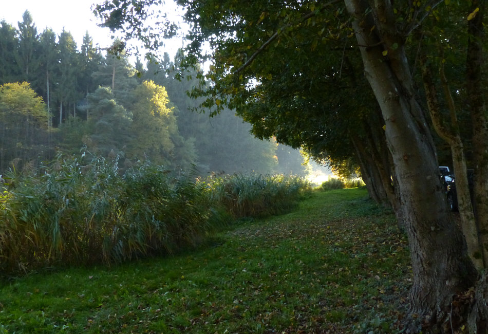 Wir kommen zum kleinen See des Angelvereins ... ![]() ... der hinterm Schilf zu finden ist. Dort hinten im hellen Teil taucht ... wenn ich näher rangehe und anders belichte ... ein ... ![]() ... etwas skurril gewachsener Baum auf. Wir kommen beim im Tagebuch bereits gezeigten Pärchen vorbei ... ![]() ... die Dame muss hingefallen sein, ihre Hosen sind kaputt *gg*. Aber wenden wir uns doch dem Wasser zu ... ![]() ... ja doch, erste Herbstfarben sind zu sehen. Besonders schön spiegelt sich der Bewuchs des Ufers im Wasser ... ![]() ... und sorgt für eine besonders schöne fotografische Komposition: ![]() Dem etwas skurril gewachsenen Baum begegnen wir am Ende des Sees wieder ... ![]() ... und rechts sehen wir schon die Fischerhütte, wo man im Freien sitzen und essen kann, was vorgestern auch sehr gut angenommen wurde. Die Menschen aßen hemmungslos Knödel, Fleisch, Bratkartoffeln ... ... während die Hunde entweder schon verhungert waren ... ![]() ... oder nah dran: ![]() Kann aber auch sein, dass sie nur geschlafen bzw. Hypnose geübt haben ;)). Einmal um den kleinen Angelsee an einem wunderbaren Sonntag Nachmittag. |
