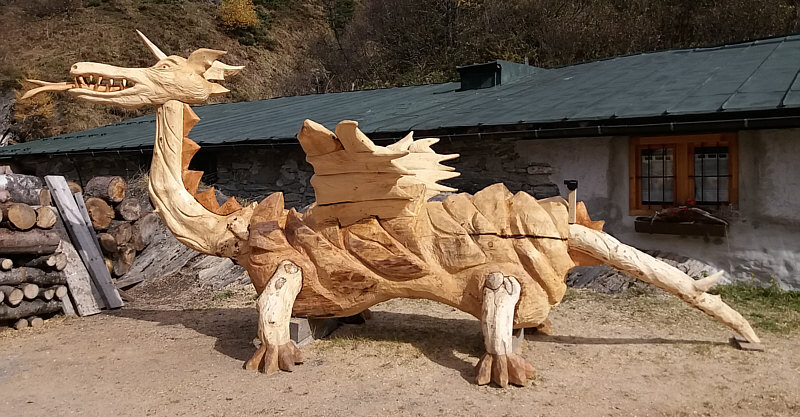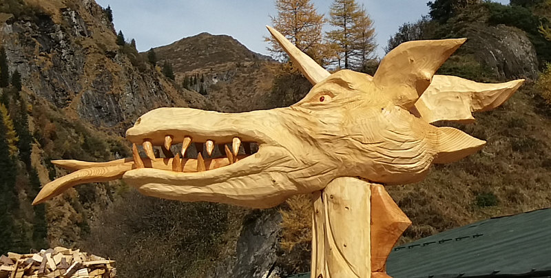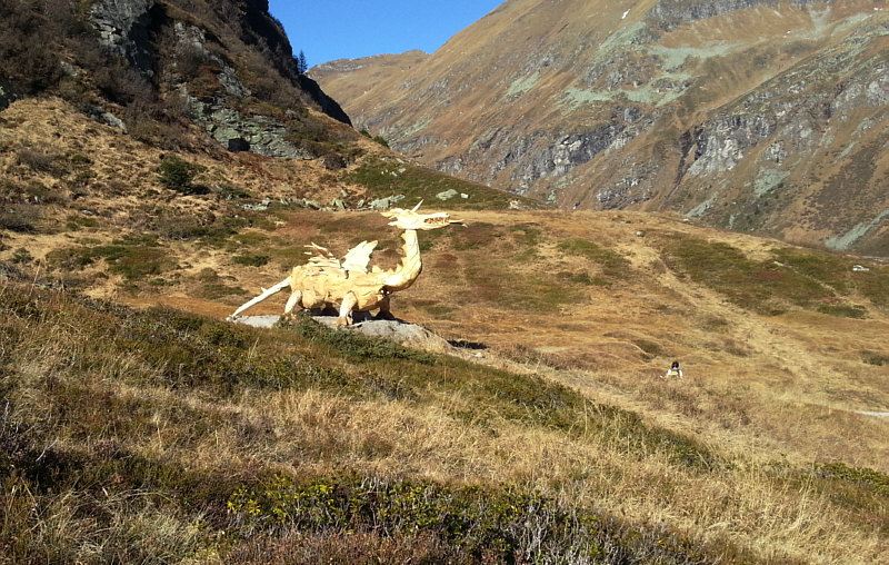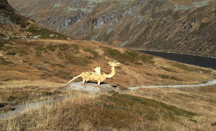 Das Bild gestern ... ![]() Die Bergrettung ? Vielleicht ist es ein Hubschrauber der Bergrettung, aber hier wird niemand gerettet. Rettungsübung ? Hier ist niemand in Not. Lastentransport ? Wenns schwer ist, was transportiert wurde, dann kann man das so sagen. Ein Kleinflugzeug hängt dran ? Nee, fliegen kann das Dingens nicht. Ein Mensch hängt dran ? Nein ... gottseidank nicht. Versorgung einer Hütte ? Nein, eher ein Verschönerungsflug. Dinosaurier ? Nicht wirklich ... aber es hat Beine und Schwanz. Nessie zieht in die Alpen um ? Fast ... es müsste heißen "Nessie zieht in den Alpen um" ... wobei Nessie aber ein Eigenname wäre und nicht ein Bewohner eines schottischen Sees. Der Drache wurde nämlich schon in den Alpen geboren ... ![]() ... und ich kann Euch sagen: es war eine harte und lange Geburt. Und es ist ein schweres Kind geworden ... ![]() ... über eine Tonne wiegt dieser Drache, der vom Künstler Josef Neumann geboren wurde. Wir sind in der Heimat von Christine B. ... im Gasteiner Tal. Dieser Drache ging dann auf Reisen ... ![]() ... in Richtung ... ![]() ... Bockhartsee ... denn wo heute dieser See liegt, war früher angeblich ein fruchtbares Hochtal, mit etlichen Minen, in denen kostbares Gold abgebaut wurde ... angeblich ... und weil die Bergmänner so hochmütig ob des gefundenen Goldes waren, zog das eine Strafe nach sich ... ein Drache kam und überzog das Tal mit Eis ... als dieses schmolz, entstand der Bochhartsee und verschlang die goldenen Schätze für immer ... ... diese Geschichte war Inspiration, diesen Drachen zu erschaffen. Er steht jetzt in der Nähe des Sees auf 1950 Metern Seehöhe ... ![]() ... dochdoch ... der steht am See ... einfach ein paar Meter höher gehen, dann sieht man das: ![]() Der Mann von Christine B. war gestern extra zum See gewandert, um diese Bilder zu fotografieren. Auch viele andere Wanderer sind 90 Minuten steil auf den Berg gegangen, um den neuen Bewohner zu sehen. Dieser hat sich so gefreut, dass er wunderbares sonniges Herbstwetter bestellt hatte und ausnahmsweise mal keine Flammen spuckte. Man hat ihm gesagt, das soll er auch zukünftig sein lassen, denn er sei aus Holz und da wären Flammen gar nicht so gut ;)). |