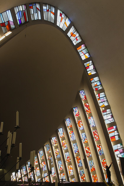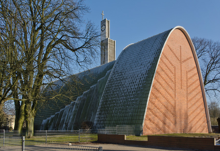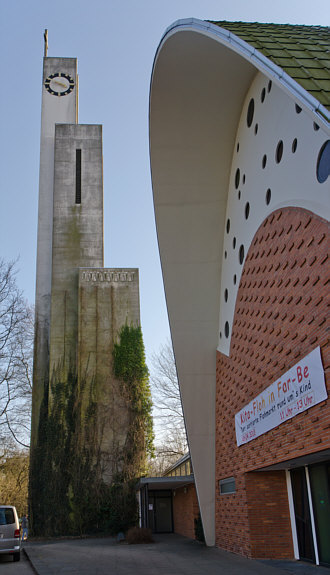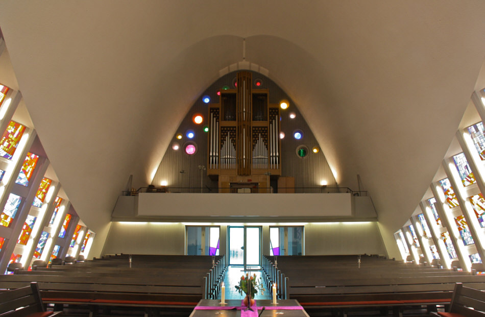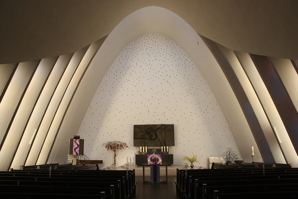 Das Kirchenschiff ... besteht aus zwei mit Aluminium verkleideten ineinander geschobenen Stahlbetonschalen mit parabelförmigem Querschnitt, die sich zu Fensterschlitzen auffalten. Die Fassaden ... sind mit aufwendigen, differenziert gemusterten Backsteinverkleidungen verziert. Außenbau und Innenraum stimmen konsequent überein. So sagt man, so ist es geschrieben und das hört sich architektonisch richtig gut an. Gucken wir doch mal ... erst von außen: ![]() Da sieht man schön die Backsteinverzierungen ... und auf der anderen Seite beim Turm ... ![]() ... ist das wieder anders gestaltet ... und es gibt noch einige Löcher in der Wand ... ... dort ist farbiges Glas drin: ![]() Die runden Kreise neben der Orgel sind die Löcher, die man außen gesehen hat. Und die Fenster rechts und links, die schauen wir uns jetzt mal genauer an ... wir stellen uns vorne neben den Altar an die Wand, so können wir diese am besten sehen: ![]() Das außergewöhnliche ist, dass wir die bunten Fenster, wenn wir in der Kirche hinten stehen und Richtung Altar blicken, gar nicht sehen: ![]() Wir sind in einer modernen Kirche in Deutschland, sie wurde 1960 erst eingeweiht. Ursprünglich gab es eine kontrastreiche Farbgebung im Innenraum ... doch ... oh wie schade ... wurde diese 1995 im Rahmen einer Restaurierung durch weiß und grau abgestufte Farbtöne ersetzt. Die auch schön sind und Ausstrahlung haben ... aber ich hätte sehr gerne mal die ursprüngliche Farbe gesehen. Die Kirche nennt sich Erlöserkirche und ist im Hamburger Stadtteil Farmsen-Berne zu finden. Willkommen in der Sonntagskirche von Seelenfarben :)) Deine Gedanken zu diesem Kircheninnenraum ? |