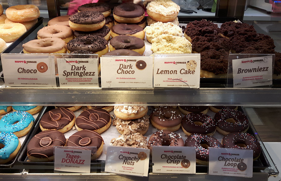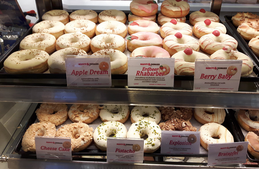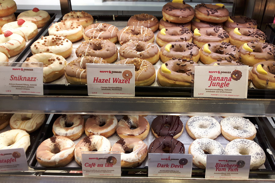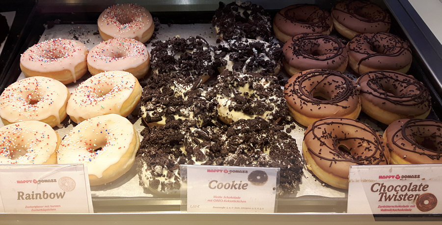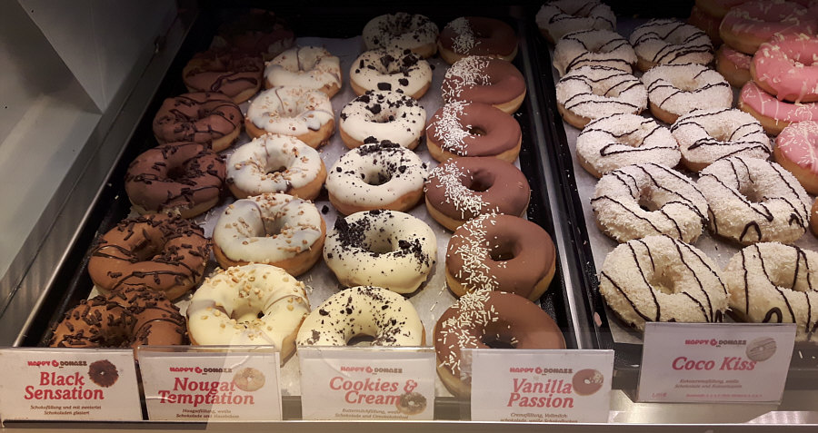 Heute gibts Krapfen mit einem Loch drin ... also Lochkrapfen. Man kann natürlich auch Donut dazu sagen ;)). Aber nicht irgendwelche Donuts, sondern die Riesenauswahl ... schaut mal ... zuerst die ungefüllten Donuts: ![]() Sugar Bear - Zuckerkugeln und Gummibärchen American Glazed - Zuckerglasur Happy Kids - weiße Schokolade mit Schokolinsen White Choco - weiße Schokolade American Crystal Cimmaron - (Kristall)zucker und Zimt American Crystal - (Kristall)zucker Homer 2.0 - Erdbeerschokolade und bunte Zuckerstreusel Hazelind - Schokolade, Haselnüsse, Giotto Blue Moon - Schokolade und Zuckerkügelchen ![]() Choco - Milchschokolade Dark Springlezz - Zartbitterschokolade, Schokostreusel Dark Choco - Zartbitterschokolade Lemon Cake - weiße Schokolade und Zitronenkuchenstückchen Browniezz - Zartbitterschokolade und Browniestückchen Tages-Donazz - Toffifee Crunchy Nuts - weiße Schokolade und Crunchies Chocolate Crisp - Schokolade und Crisps Chocolate Loop - Zartbitterschokolade, bunte Zuckerkügelchen ![]() Rainbow - Zuckerglasur und bunte Zuckerkügelchen Cookie - weiße Schokolade und Oreo-Stückchen Chocolate Twister - Vollmilch- und Zartbitterschokolade Nun die gefüllten Donuts: ![]() Black Sensation - Schokolade oben und innen Nougat Temptation - weiße Schokolade oben, Nougat innen Cookies & Cream - weiße Schokolade und Oreobrösel oben und Buttermilchfüllung innen Vanilla Passion - Vollmilch- und weiße Schokolade oben, Cremefüllung Coco Kiss - weiße Schokolade und Kokosraspeln oben, Kokoscreme innen ![]() Sniknazz - Schokolade und gesalzene Karamellcrispies oben, Erdnuss-Karamell-Füllung Hazel Wazel - Schokolade, Nusskrokant oben, cremige Haselnussfüllung Banana Jungle - Schokolade und Schokobanane oben, Bananencreme innen Café au lait - zweierlei Schokolade und gemahlene Kaffeebohnen oben, Espressocremefüllung Dark Devil - Zartbitterschokolade und Belegkirsche oben, Kirschkonfitüre innen Blueberry Yum Yum - weiße Schokolade und Blaumohn oben, Heidelbeerfüllung ![]() Apple Dream - weiße Schokolade und Zimt oben, Apfelzimtfüllung Erdbeer Rhabarber - Erdbeerschokolade und weiße Schokolade und Erdbeeraufleger oben, Cremefüllung mit Rhabarberaroma innen Berry Baby - weiße Schokolade, Himbeerfüllung Cheese Cake - weiße Schokolade und Butterkeksbrösel, Buttermilchfüllung Pistacho - weiße Schokolade und Pistazien, Pistaziencremefüllung Explosion - Honigschokolade, Crunchies und Krokant oben, Nougatfüllung Bratapfel - weiße Schokolade und Apfelmarmelade oben, Apfel-Zimt-Buttermilchfüllung innen Natürlich konnte ich dort nicht vorbeigehen ... und so haben Beate und ich heute noch ein Lochkrapfen-Leckerchen vor uns :)). Lies doch mal die Beschreibungen durch und suche Dir zwei Donuts aus ... welche nimmst Du ? |