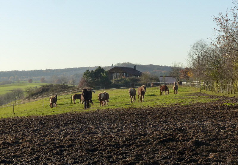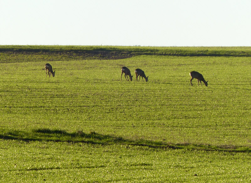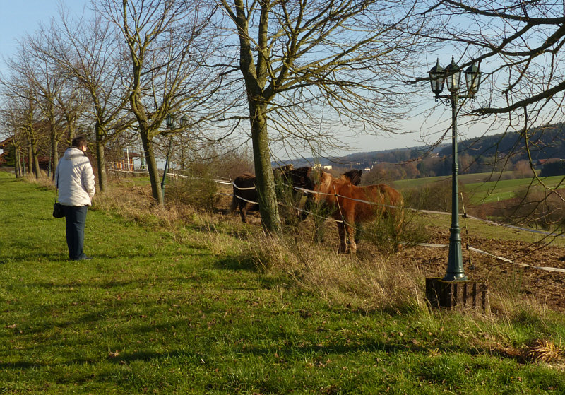Gestern hat Beate gesagt, dass sie noch nie so schönes Wetter an ihrem Geburtstag hatte ... und es war auch wunderschön ... Sonne und 13 Grad. Da war es natürlich klar, dass wir einen längeren Spaziergang machen werden ... ![]() ... auf sonnigen Wegen ... ![]() ... ich hatte extra keinen Weg im Dorf oder im Wald ausgesucht, damit nichts Schatten werfen kann und wir wirklich nur in der Sonne laufen können. Nur hie und da liefen wir ... ![]() ... an alten Weiden vorbei, doch deren Schatten lag nur auf wenigen Metern unseres Weges. Weites Land ... ![]() ... und da hinten ist etwas ... das ich natürlich nicht gesehen hätte ... aber Beates Luchsaugen ... ... sendeten an ihr Gehirn die Botschaft, zu mir zu sagen "sind das da hinten ... ![]() Rehe ?" ... diese vier Mini-Punkte da ... und ja, es stimmte ... ![]() ... dort hinten grasten Rehe. Immer mehr Tiere begleiteten unseren Spaziergang ... ![]() ... zuerst die Stare ... ![]() ... von denen einige sich für Beate schön machten ... ![]() ... und Gefiederpflege betrieben. Wir kamen an Pferden vorbei ... ![]() ... und zum Blockhaus ... es war so schön, dass man fast hätte draußen sitzen können ... ![]() ... wenn denn das Lokal geöffnet gewesen wäre. Direkt in der Nachbarschaft sind einige Pferdekoppeln ... ![]() ... und die Pferde kamen auch stets neugierig auf uns zu: ![]() Hühner und einen Hahn gabs auch ... ![]() ... und eine Henne hatte ein etwas anderes Äußeres ... reinweiß, langes Wuschelgefieder und graues Gesicht: ![]() Eine Mütze hängt dekorativ auf einem Pfosten ... ![]() ... und vielleicht findet sie ja wieder zurück zur Besitzerin oder eine neue Heimat. Zum Abschluss des gestrigen Spaziergangs erblickte unser Auge für November ungewohnt grüne Strukturen ... ![]() ... die ihren ganz eigenen Reiz haben: ![]() Danke fürs Mitlaufen :)). |