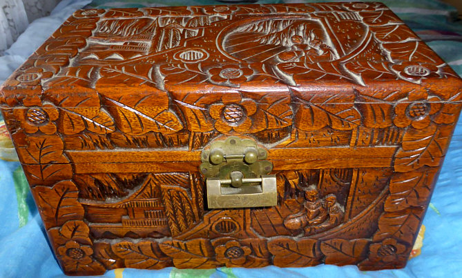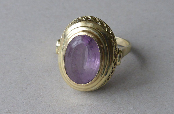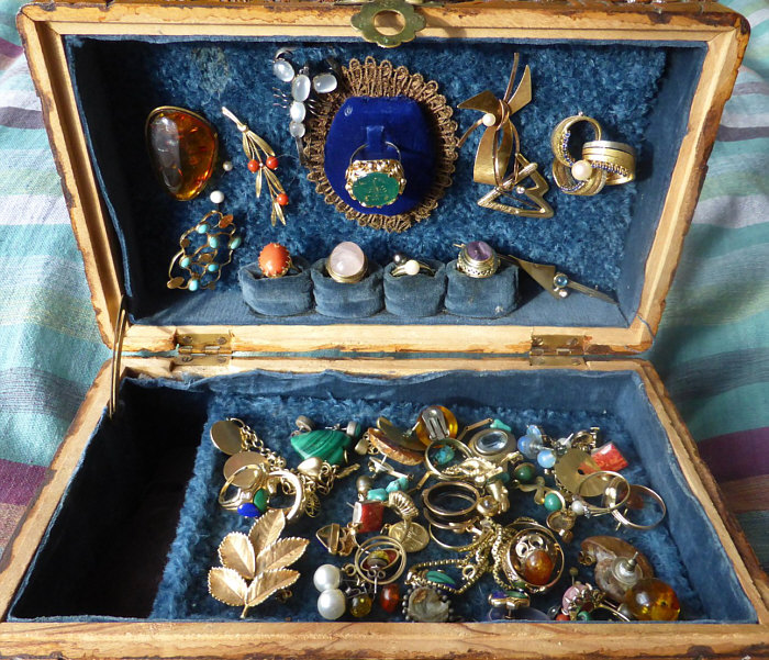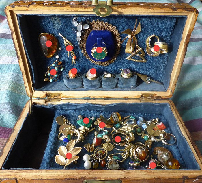 Da gab es doch mal die Seelenfärblerkästchen ... ... und da bekam ich auch dieses Bild geschickt ... ![]() ... und natürlich fragte ich, was da drin sei ... und dann kam dieses Foto: ![]() "Ist ja der Wahnsinn" dachte ich ... und dann musste ich sofort rote Punkte ... ![]() ... auf einzelne Schmuckstücke machen und die Seelenfärblerin fragen, ob sie denn nicht diese schönen Stücke fotografieren wolle, damit ich sie zeigen kann. Und ... sie hat "ja" gesagt :)) ... und sie hat sich sogar allergrößte Mühe dabei gegeben und so dürfen wir heute einen kleinen Blick in das Schmuckkästchen werfen :)). 1 ![]() Vor 40 Jahren in Italien handgefertigte Brosche mit Türkisen 2 ![]() Goldring mit Koralle 3 ![]() Brosche mit Bernstein 4 ![]() Erbstück ... Brosche aus Rot-/Gelb- und Weißgold mit Saphiren und Perle 5 ![]() vergoldetes echtes Rosenblatt 6 ![]() Kettenanhänger, Ring und Ohrringe mit Opalen 7 ![]() Erbstück ... Goldring mit Amethyst Aber natürlich gibt es noch weitere Folgen, in denen ich weitere Schmuckstücke zeige :)). Eure Gedanken zum Schmuck bzw. den größer gezeigten Stücken ?? |
