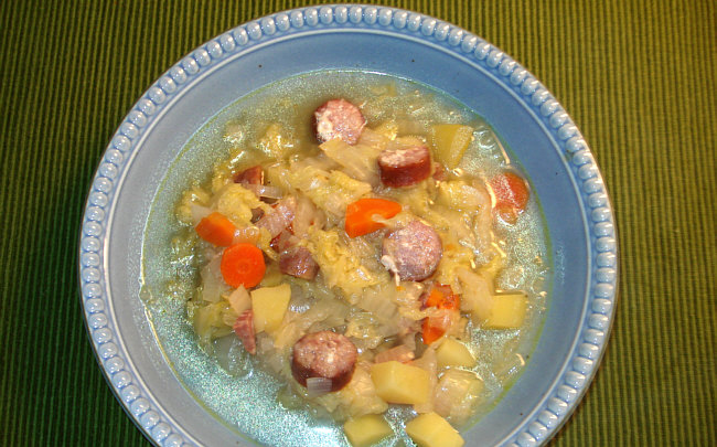 Ich koche ihn mit Zwiebeln, Möhren, Kartoffeln und Mettwurst.