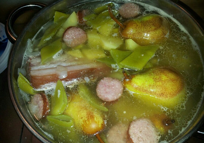 Ich habe Birnen, Bohnen und Speck gekocht.