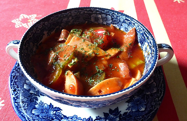 Wer lieber Würstchen mag, kann sie in Scheiben geschnitten im Eintopf