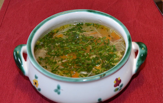 In die angerichtete Suppe werden die gekochten Nudeln und Schnittlauch