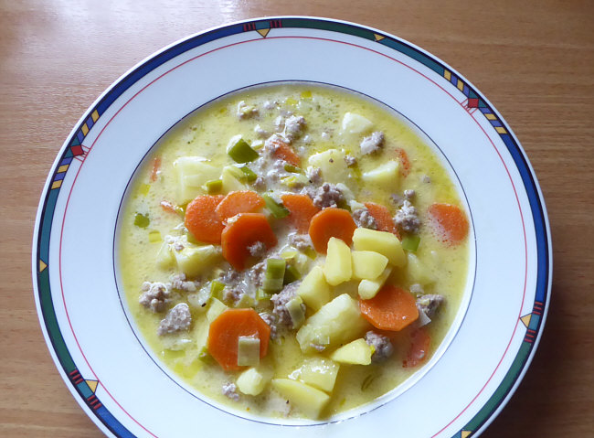 eine Kartoffel-Gemüsesuppe mit Hackfleisch.
