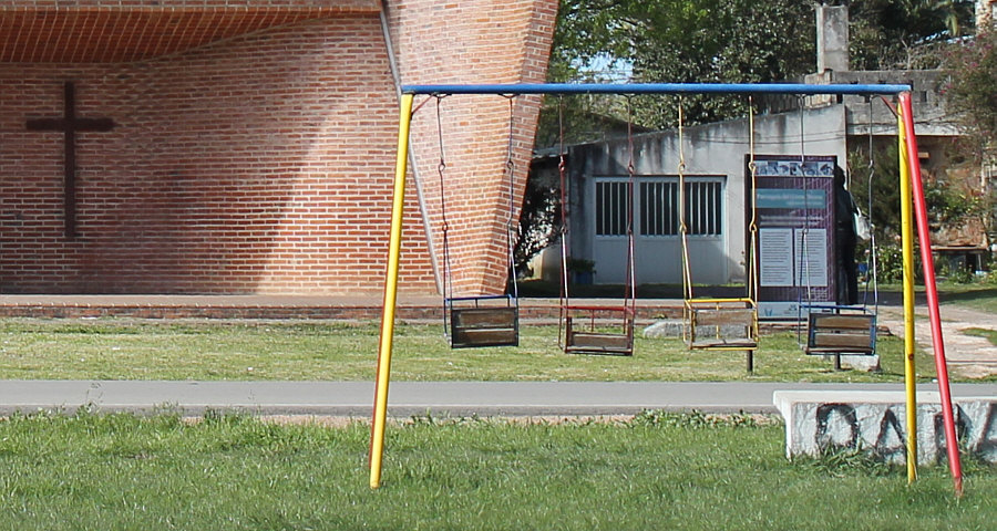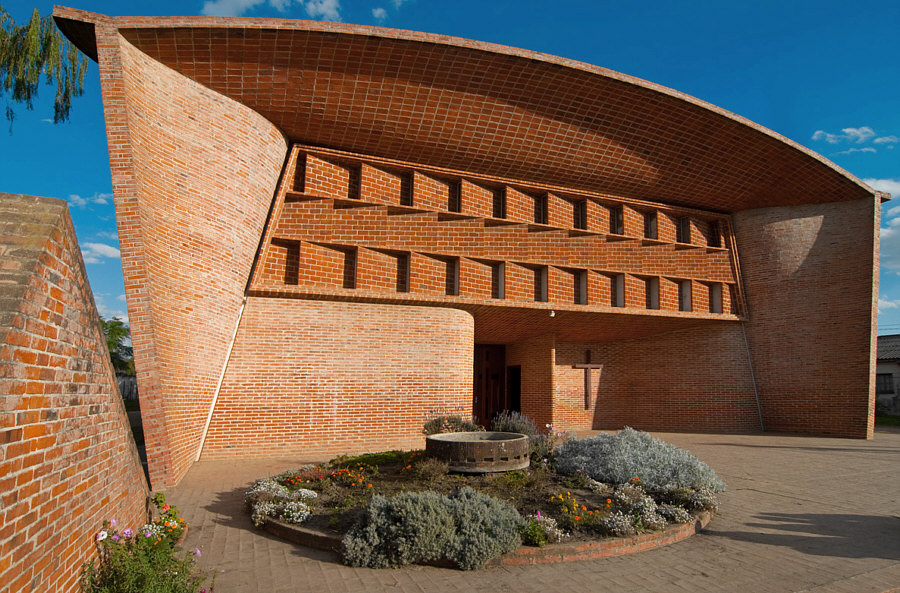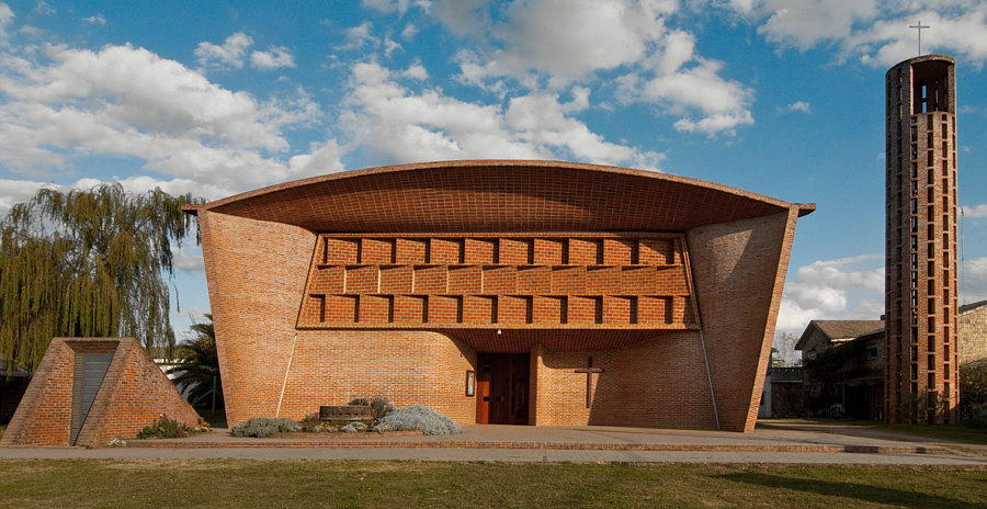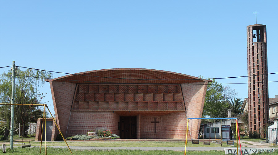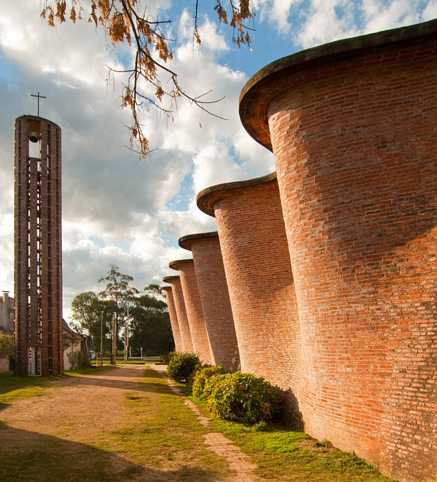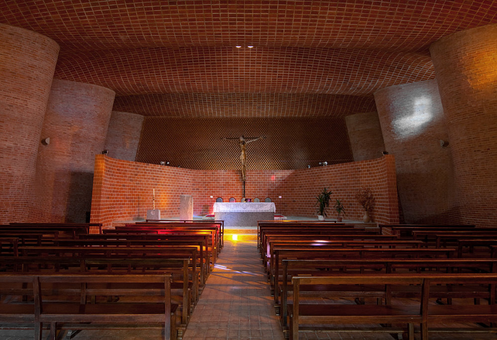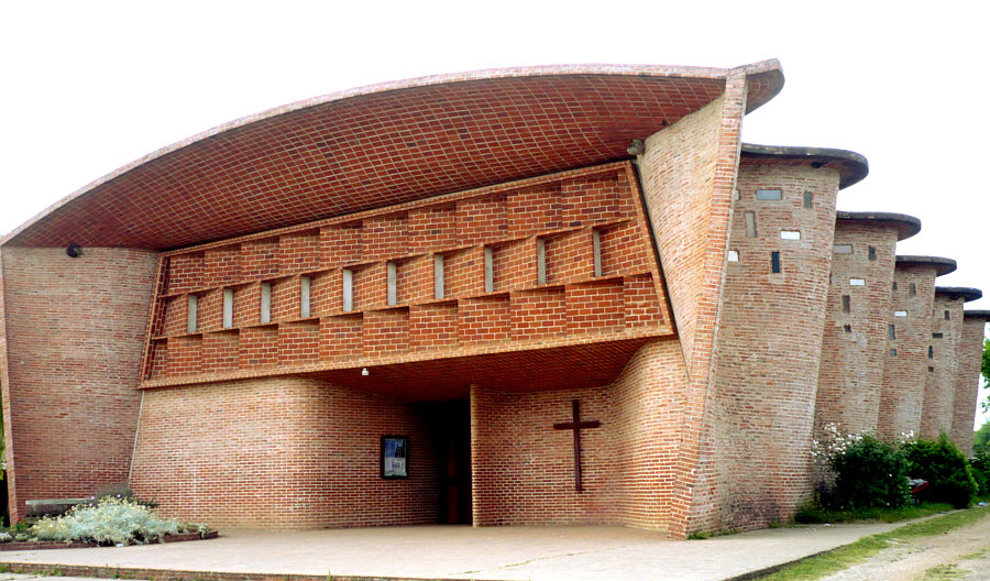 Die heutige Kirche ist auf mehrfache Weise eine besondere Kirche. Schauen wir uns doch zuerst ... ... die Kinderschaukel an: ![]() Okay ... es gibt heilere und modernere Schaukeln ... und auch weiter rechts ist eine: ![]() Für die etwas kleineren Kinder ... und dahinter das Kreuz der Kirche. Ein Blick auf die ganze Kirche ... ![]() ... offenbart noch Stromleitungen und einen seperat stehenden Kirchturm. Auf den ersten Blick ein Klotz mit vielleicht schönen Details ? Gehen wir doch mal näher ... ![]() ... und lassen Schaukeln und Stromleitungen weg ... und schauen nur auf die Kirche. Wir gehen näher ... aber noch nicht hinein ... wir gehen weiter nach links und ... sind ganz überrascht ... ![]() ... denn rechts zeigt das Gebäude Bögen bzw. Wellenlinien. Das haben wir nun gar nicht erwartet. solche Architekturdetails zu sehen. Ein ganz anderes Bild sehen wir da ... ![]() ... gar nicht mehr so starr ... sondern geschwungene Linien. ![]() ![]() Jetzt sind wir aber mal sehr gespannt, wie es innen aussieht ... ![]() ... doch vorher will ich Euch noch etwas über die Kirche sagen. Das ist eine römisch-katholische Kirche, die 1952 entworfen und 1958-1960 erbaut wurde. Von einem der bekanntesten Architekten des Landes, der vieles gebaut hat und vielfach geehrt wurde. Diese Kirche ist wohl das bekannteste Werk von Herrn Eladio Dieste. Ich hab ja einige Überraschungen versprochen ... die Kinderspielgeräte unmittelbar vor dem Eingang, die gerade Front und an der Seite dann diese Wellenlinien, auch diese warmroten Ziegelsteine sind etwas Besonderes, denn wir sind hier ja nicht im Norden von Europa ... diese Kirche steht in der Stadt "Estación Atlántida". Ca. 50 Kilometer weiter westlich liegt die Hauptstadt des Landes, Montevideo ... wir sind in Uruguay. Und nun gehen wir in die Kirche hinein: ![]() Willkommen in der Sonntagskirche von Seelenfarben. Deine Gedanken zu diesem Kircheninnenraum ? Einen Link habe ich noch für Euch: Ingenieurportrait des Architekten. |