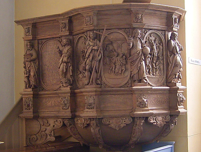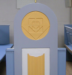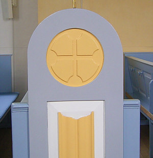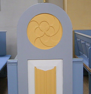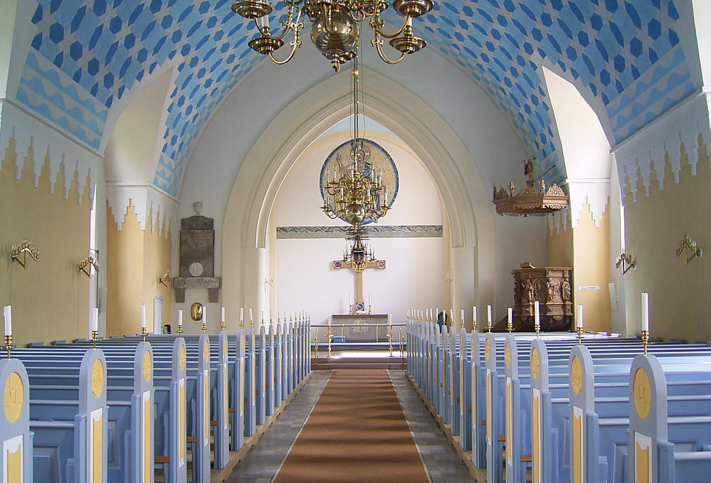 So sieht die Kirche ... ![]() ... von außen aus ... schöne dekorative Querstreifen ... ![]() ... und die Spannung steigt ... wie mag sie wohl von innen aussehen. Wir gehen rein ... ![]() ... und als erstes fallen uns die Außenseiten der Sitzbänke auf, denn da hat jede ein andere Dekoration: ![]() ![]() ![]() Ganz anders und viel älter ist das Schmuckstück von Kanzel: ![]() Und nun blicken wir nach vorne zum Altar und erleben unser blaues Wunder: ![]() Wir sind in Dänemark, in Hobro, einer 12000-Einwohner Stadt im Norden des Landes. Willkommen in der Sonntagskirche von Seelenfarben. Deine Gedanken zu diesem Kircheninnenraum ? |