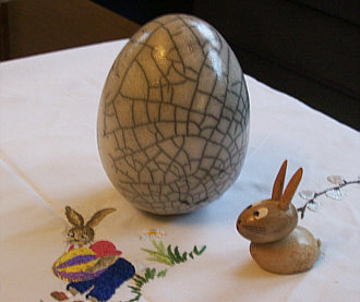 Der Hase ... aus Holz, das Ei ... Keramik im Rakubrand ... die Tischdecke aus