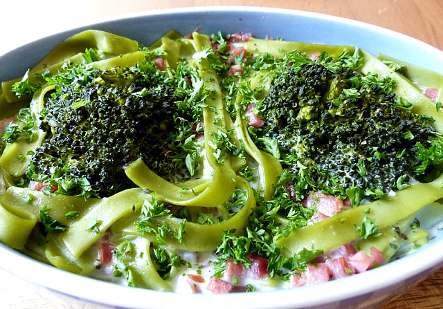 Darüber Schinkenwürfel und 1 Beutel Maggi fix & frisch Brokkoli-Gratin.
