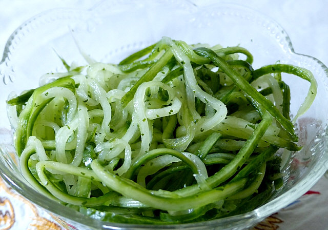 Gurkensalat in Spaghettiform mit Bärlauch.