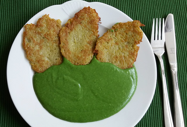 Wir essen die nämlich nicht mit Apfelmus sondern mit Spinat.