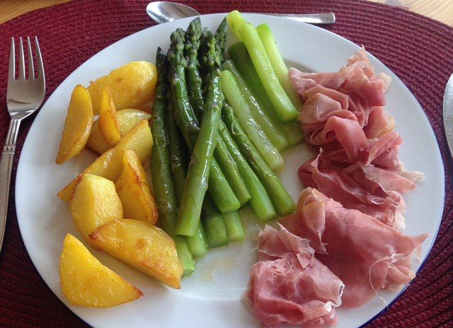 Grüner Spargel ... diesmal mit Kartoffelspalten und ganz dünn
