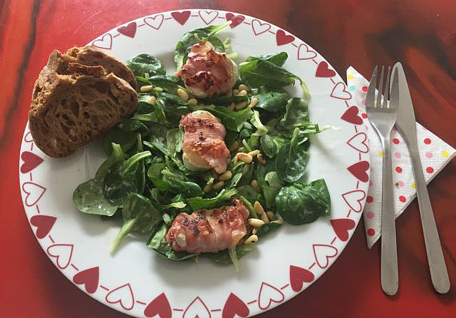 Feldsalat mit gerösteten Pinienkernen und gebratenem Bacon-Ziegenkäse!