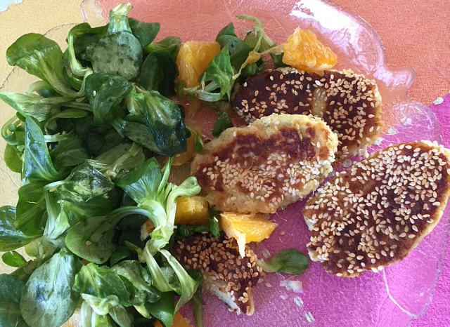 Feldsalat mit frischen Mangostückchen und Kartoffelbällchen mit Sesam.