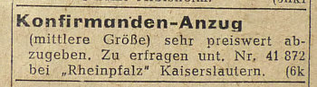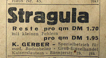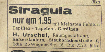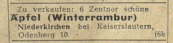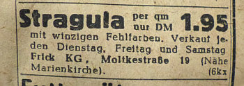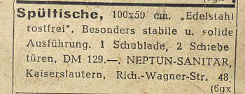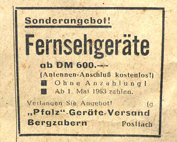 Ich hab Euch ja einen zweiten Teil versprochen ... ... heute schauen wir mal bei diesem alten Zeitungsteil ... ![]() ... in die Kleinanzeigen und das Fernsehprogramm. Und der Gewinner bei den Kleinanzeigen (es gibt nur "Verkäufe") geht an ... ... Stragula. Gleich drei Anzeigen gibts davon ... ![]() ![]() ![]() ... das war also damals richtig "in". Info lt. Wikipedia: Stragula ist eine Linoleum-Imitation und bestand aus mit Teer imprägnierter Pappe (Bitumenpappe), die vorzugsweise mit verschiedenfarbigen eingedickten Ölfarben in verschiedenen Mustern bedruckt wird. Stragula wurde von den Deutschen Linoleum-Werken hergestellt und war preiswerter als Linoleum. Es wurde überwiegend als Meterware zum Auslegen ganzer Räume verkauft, es gab aber auch Stragula-Läufer oder -stücke, deren Muster die von Orientteppichen nachahmten. Seit den 1970er Jahren wurde es durch den Kunststoff PVC weitgehend verdrängt, möglicherweise, weil in den Ölfarbmustern an viel benutzten Stellen mit der Zeit Laufstraßen entstanden, zudem wird das Material durch Alterung mit der Zeit brüchig und rissig. Ja, Stragula lag auch bei uns auf dem Boden. Weiter gehts mit den Anzeigen: ![]() ![]() 129 DM damals entsprechen etwas 1250 Euro heute. ![]() ![]() ![]() ![]() ![]() Auch bei uns gab es in den 60er Jahren Ölofen und im Keller stand ein Öltank. ![]() ![]() Wer kennt die Sorte Winterrambur ? Was passiert, wenn man in den Supermarkt geht und fragt "haben sie Winterrambur" ? Lt. Wikipedia: Der Rheinische Winterrambur wird auch Jägerapfel, Teuringer oder Menznauer Jäger genannt. Die Äpfel sind groß bis sehr groß und flachrund. Die Früchte weisen häufig Unregelmäßigkeiten auf. Die glatte, fettige Schale ist zunächst hellgrün, wird später goldgelb bis hellrot und auf der Sonnenseite dunkelrot marmoriert bis verwaschen, wenn der Apfel ausgereift ist. Das gelblich-weiße bis weiße Fruchtfleisch schmeckt süßlich, schwach gewürzt, ist säurearm und reich an Vitamin C. Die Früchte duften intensiv. Der Rheinische Winterrambur ist von Dezember bis März, bei geeigneter Lagerung bis Mai, genussreif. Die Sorte kann als Wirtschaftsapfel, Tafelapfel und für die Herstellung von Fruchtsaft und Brand genutzt werden, wobei einige Quellen in Zweifel ziehen, ob die Sorte die nötige Güte für einen Tafelapfel erreicht. Hingegen zeigen sich zum Beispiel erst durch das Backen, als Bratapfel oder im Kuchen die wahren geschmacklichen Vorzüge mit einem sortentypisch feinsäuerlichem Aroma. Der Rheinische Winterrambur ist eine sehr alte Apfelsorte, die schon um 1650 bis 1700 bekannt war. Bis zur ersten Hälfte des 20. Jahrhunderts war er ein verbreiteter Winterapfel. Die langlebigen Bäume trifft man auch heute noch in alten Streuobstbeständen an. In Rheinland-Pfalz ist die Sorte sehr verbreitet. ![]() ![]() 85 x 60 ist nicht groß ... umgerechnet auf heute sind das 3500 Euro gewesen. ![]() Okay, das ist keine Kleinanzeige, aber will ich doch hier zeigen. Ist denn 90 Jahre auch heute noch ein "gesegnetes" Alter ? Gibts heute noch Geschenkkörbe vom Landrat ? Kommen wir zum Fernseher ... ![]() ... der damals ab 5500 Euro (umgerechnet) gekostet hat. Deswegen hatten auch nur wenige Menschen einen solchen Apparat und nun schauen wir mal, ob sich das Programm denn gelohnt hat. TV-Programm Donnerstag, 21. März 1963 ARD Familienprogramm 17.00 Uhr - Wie das Elefantenkind seinen Rüssel bekam (Puppenspiel) 17.20 Uhr - Spiel und Spaß im Negerdorf, ein Filmbericht aus Afrika 17.45 Uhr - "Als ich noch der Waldbauernbub war" Regionalprogramm SWF 18.20 Uhr - Mit 1 PS durch Dänemark 18.50 Uhr - Abendschau 19.20 Uhr - "Sag die Wahrheit" Regionalprogramm Saarbrücken 18.30 Uhr - Hauptgewinn: 6 19.00 Uhr - Blick ins Saarland 19.30 Uhr - Sandmännchen 19.40 Uhr - Intermezzo 20.00 Uhr - Tagesschau 20.20 Uhr - "Lumpazivagabundus oder Das liederliche Kleeblatt" Zauberposse, Nestroy, Aufzeichnung von den Salzburger Festspielen 1962 22.50 Uhr - Tagesschau ZDF 20.20 Uhr - Das Podium - Gespräch über kulturelle Fragen 21.00 Uhr - Ladislav Fialka und sein Ensemble (Pantomimentheater) 21.45 Uhr - Aus den Kindertagen des Films: Dracula 22.10 Uhr - Mit anderen Augen Das wars, mehr gab es nicht ... nicht früher, nichts nach 23 Uhr und nur diese beiden Programme. Das wars auch mit der Zeitung ... und unserer kleinen Zeitreise 55 Jahre in die Vergangenheit. |