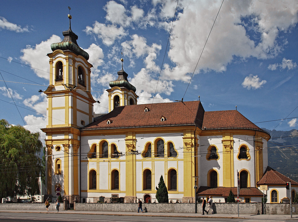 Die Basilika steht mitten in einer großen Stadt ... ![]() ... und vor ihr ein großer Friedhof: ![]() Wenn man auf dem Friedhof ist ... ![]() ... dann sieht man die Berge ... diese Kirche ... ![]() ... steht in einer Stadt, die mitten in den Alpen liegt ... in Innsbruck, im Stadtteil Wilten und so heißt die Kirche auch die "Wiltener Basilika". Eine viel besuchte Wallfahrtskirche, die von den Prämonstratensern des nahen Stiftes Wilten betreut wird. Die Wiltener Basilika gilt als die Mutterpfarre der Stadt Innsbruck. Unter dem heute bestehenden Kirchengebäude wurden die Reste einer Vorgängerkirche gefunden, die auf die Zeit des frühen Christentums, das 5. Jahrhundert, datiert wurde. Schon seit 1140 betreut der Prämonstratenserorden die Kirche, das heutige Gebäude hat um 1750 den baufällig gewordenen Vorgängerbau ersetzt. Diese Kirche ist heute eine der meistbesuchten Sehenswürdigkeiten der Stadt. Der Innenraum ist in zarten Farben gehalten, vermischt mit viel Gold und zierlichem Rokokostuck. Über dem Hochaltar sind vier Säulen und eine große Krone. Und nun gehen wir mal rein: ![]() Willkommen in der Sonntagskirche von Seelenfarben :)). Deine Gedanken zu diesem Kircheninnenraum ? |